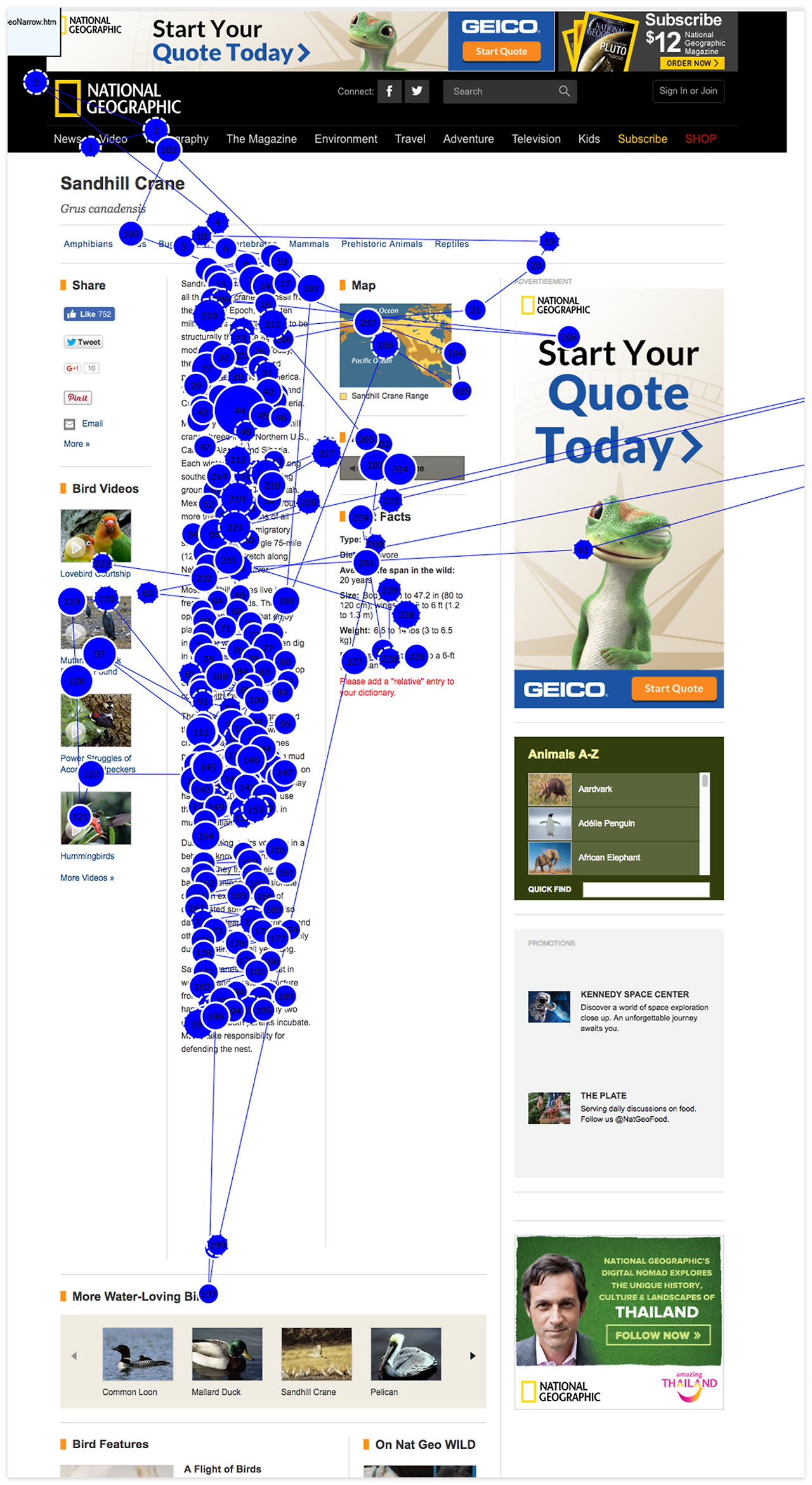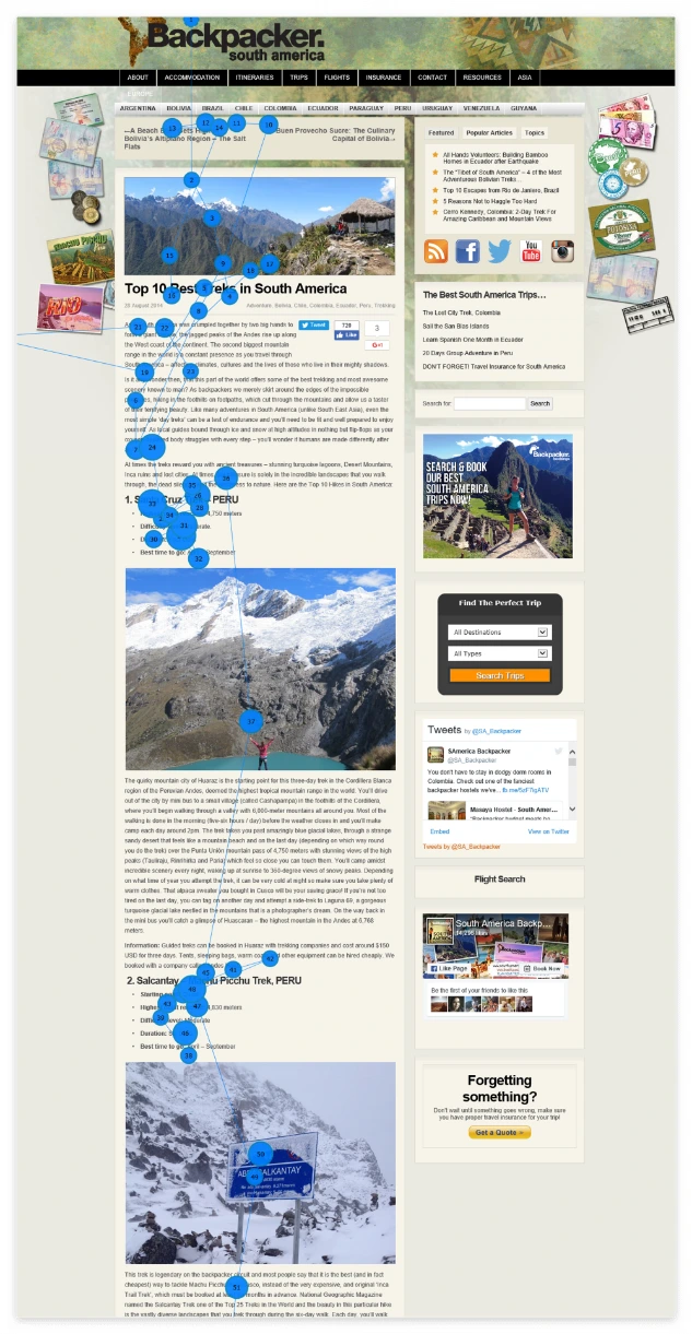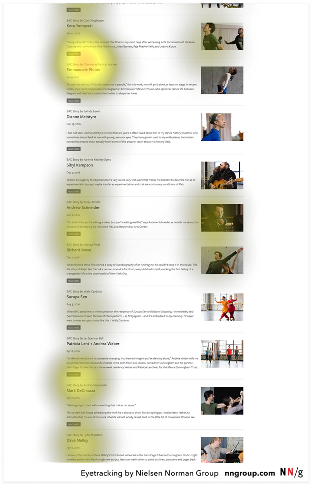 사진을 보면 페이지 제목이나 글의 상단 부분을 읽다가 아래로 내려가면서 단락의 첫 번째 문장만 골라 읽고, 더 내려갈수록 읽는 양이 줄어드는 것을 확인할 수 있다. 이를 제목이나 목록, 진한 글자처럼 사용자의 시선을 유인할 만한 디자인적 장치가 없는 경우에 본능적으로 읽게 되는 패턴으로 해석할 수 있다.