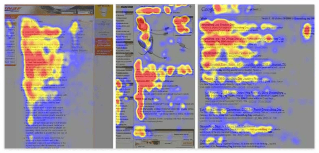 위 사진은 2006년 Nielsen Norman Group에서 232명의 사용자를 대상으로 아이 스캐닝 패턴을 조사한 것이다. 사용자들의 시선이 많이 겹치는 곳일수록 열상을 띄도록 표현한 것인데, 컨텐츠를 보는 패턴이 영대문자 'F' 형태로 꽤나 일치하는 것을 볼 수 있다.