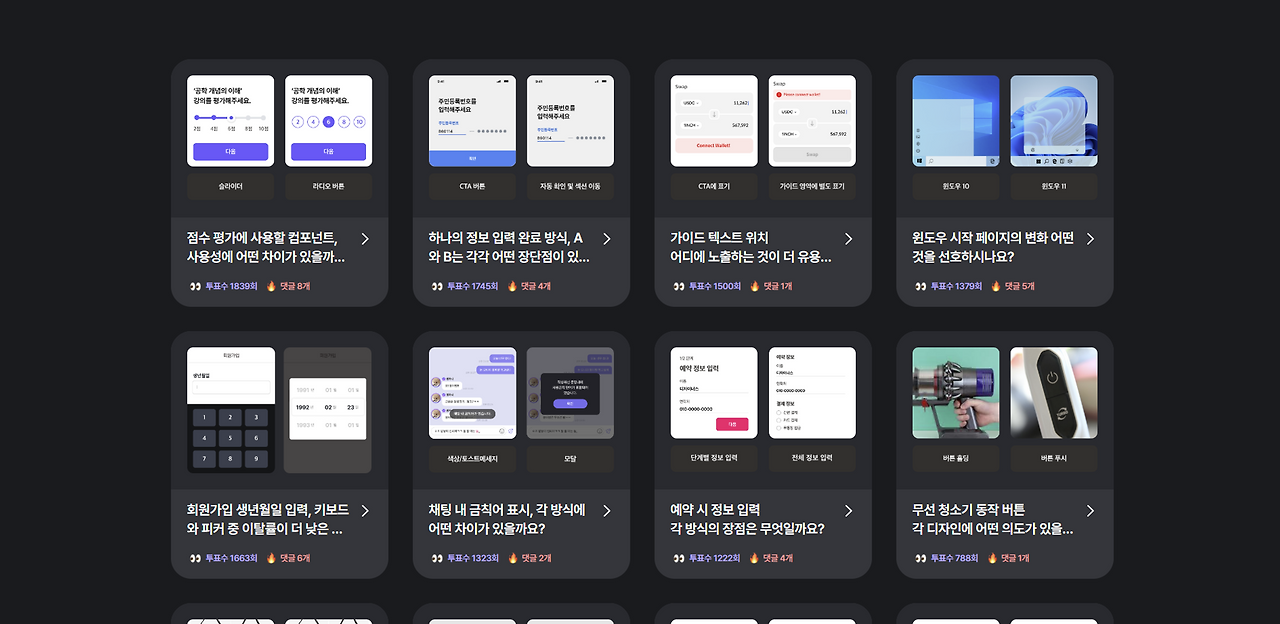 아래 사진처럼 비슷하지만 다른 UX를 줄 수 있는 것들을 가지고 A/B 테스트를 유저 투표로 진행하는 형태인데, 보통 500명 이상이 투표에 참여하기 때문에 나중에 화면을 설계할 때 꽤나 참고할만한 내용들을 확인할 수 있어서 좋다.