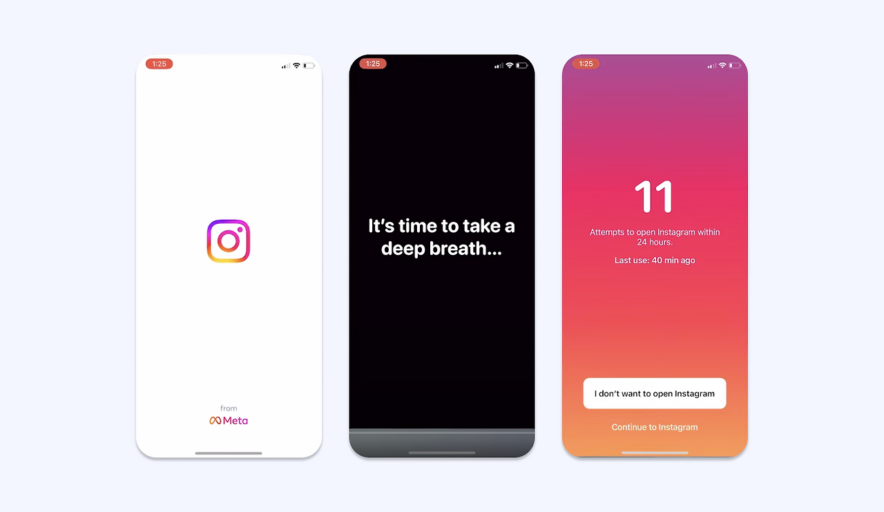 One Sec 앱은 이 앱을 통하 설정한 특정 앱을 실행할 때, 실행한 앱을 즉시 사용하지 못하도록 사진처럼 별도의 스크린으로 사용을 잠깐 막아버린다.