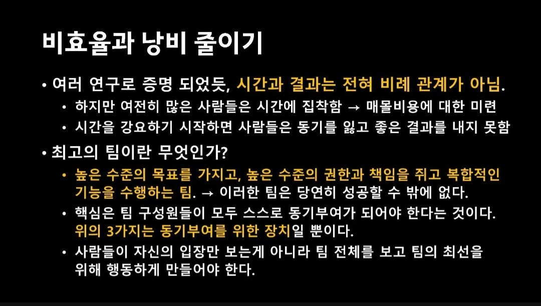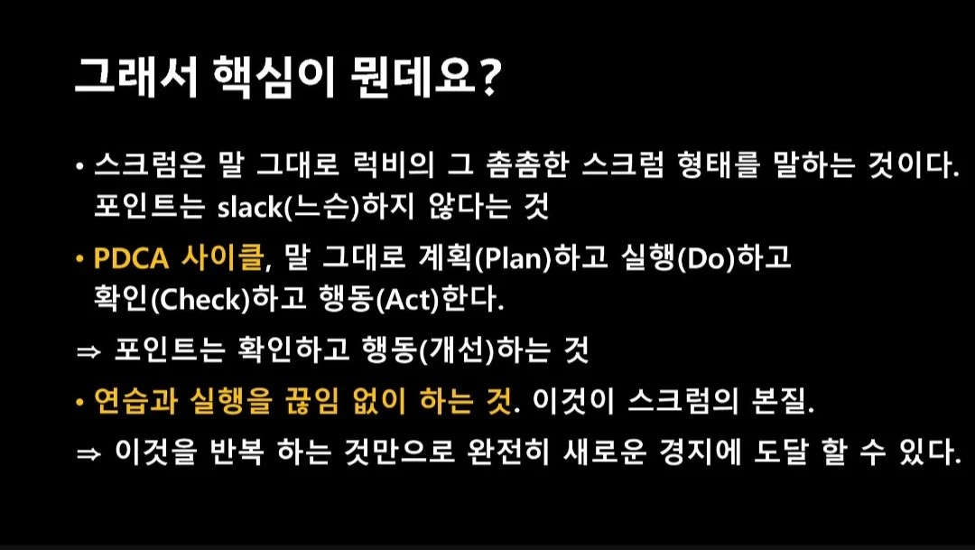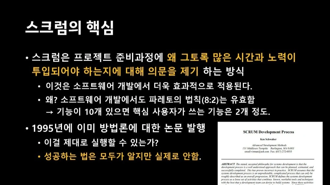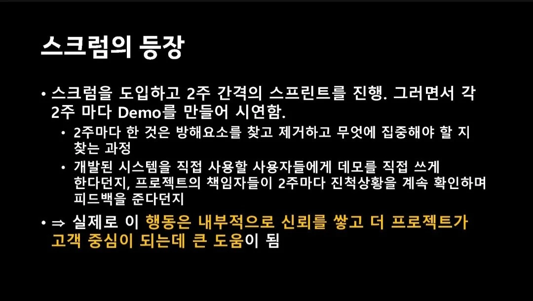 사진은 특히 와닿은 내용을 캡처한 것이다. 실제 자료에서는 1) 이 프로젝트 관리 방법이 IT 산업 외에서도 어떻게 사용됐는지 사례들과 2) 스크럼이 단순한 프레임워크를 넘어 어떤 의미를 가지는지 확인할 수 있다.