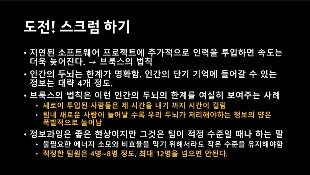 - 그래서 발표 자료에서는 애자일한 조직의 적정 인원수를 4~8명, 최대 12명을 제안하고 있다.