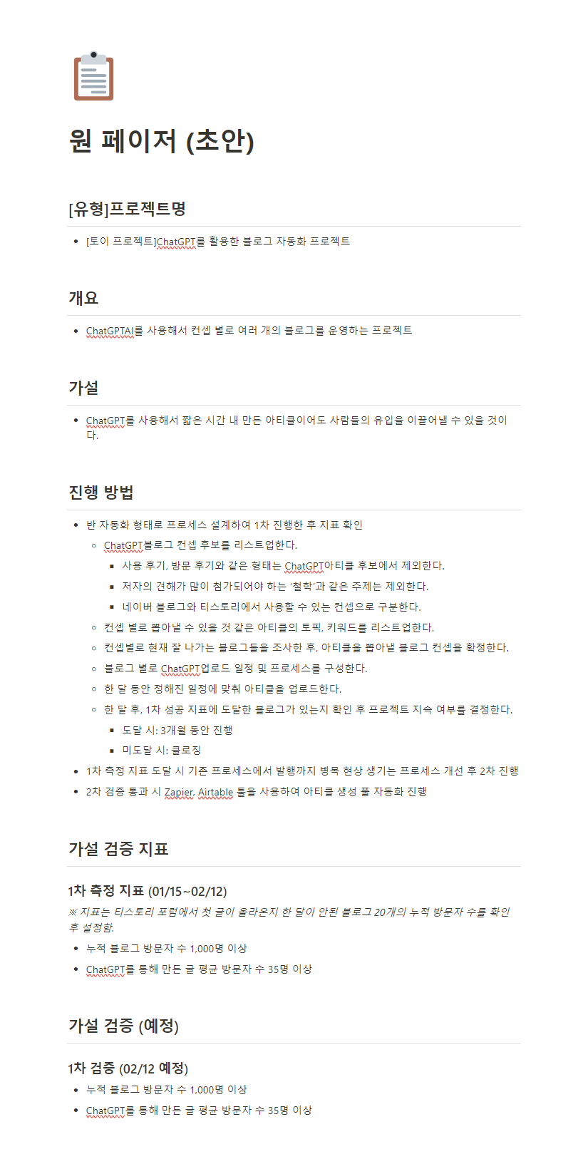 이때 호기심과 아이디어가 생겨났다. “ChatGPT를 이용해 짧은 시간 내에 만든 아티클이어도 사람들의 유입을 끌어낼 수 있을 것인가? 그리고 이걸 기반으로 글 쓰는 습관을 만들면 어떨까?” 라는 것. 영상에서 말해준 깊이로 배우는 것은 전혀 어렵지 않으니 우선 노션을 켜고 떠오른 생각들을 정리하고 원 페이저를 작성했다.