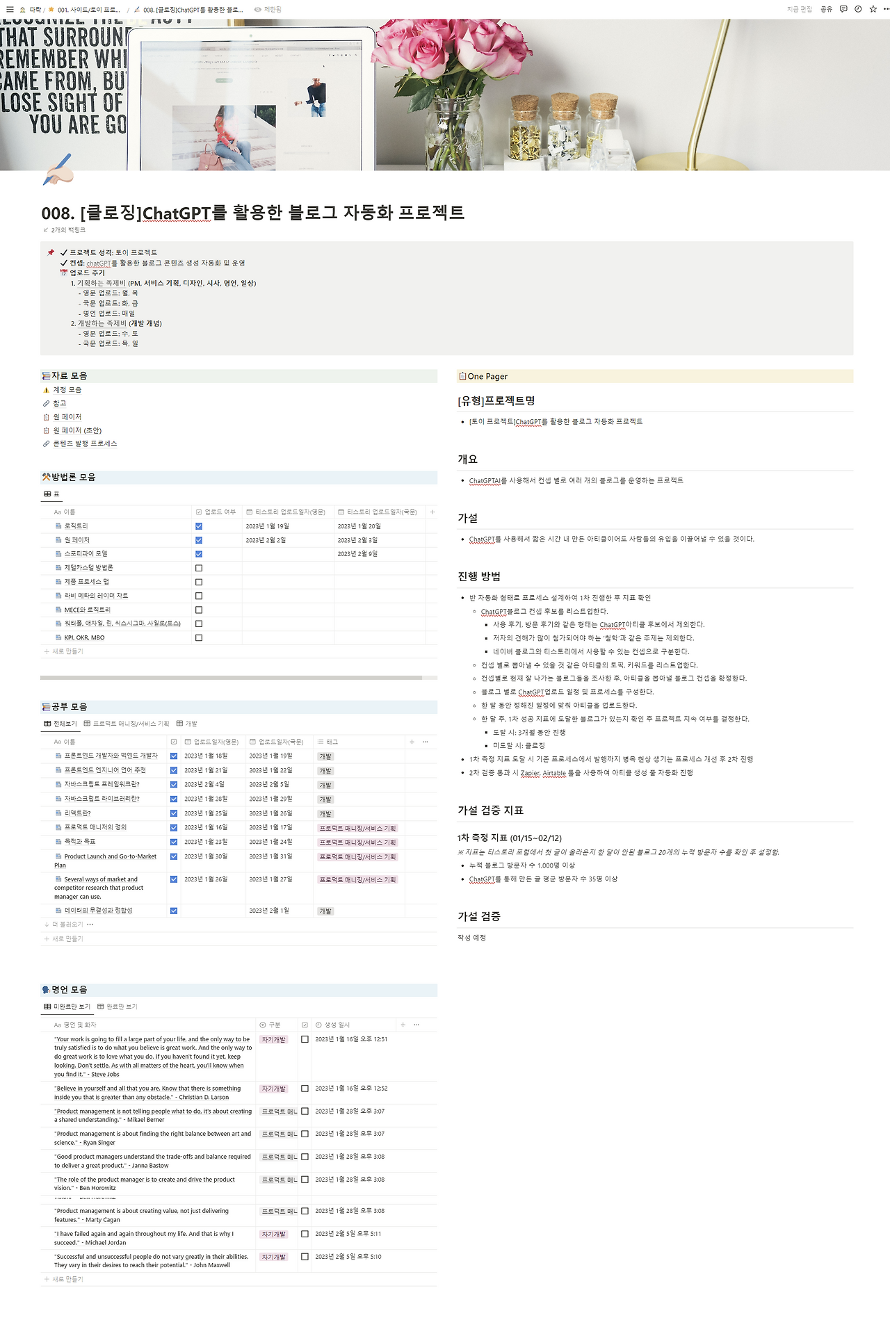목적을 정한 후 목적을 달성하기 위한 목표를 세팅하고 이에 맞춰 노션페이지를 정비했다. 원 페이저는 동기화 블록으로 해당 노션페이지에 대문짝 하게 걸어놓아 계속 상기할 수 있도록 했고, 글의 경우에는 카테고리를 크게 방법론과 프로덕트 매니지먼트, 개발에 대한 내용으로 정한 후 기존에 관련해 관리하던 DB들을 참조 걸어 가지고 왔다.