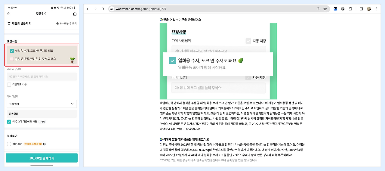 배민에서는 일회용품을 받지 않는 옵션이 기본 설정되어 있다. ⓒ 배달의민족