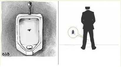 아래는 인터넷에 넛지를 검색하면 나오는 대표적인 활용 사례다. 소변기의 파리 그림이 의미하는 바와 설계자가 의도한 결과는 말하지 않아도 알 수 있을 것이다. 이처럼 넛지는 타인의 행위를 설계자가 의도한 방향으로 자연스럽게 유도하는 역할을 한다.