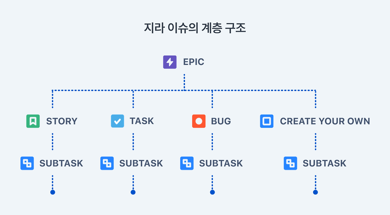 이슈도 조직, 기업 목표처럼 위계가 존재한다. 지라에서 제안하는 이슈의 위계는 이와 같다.