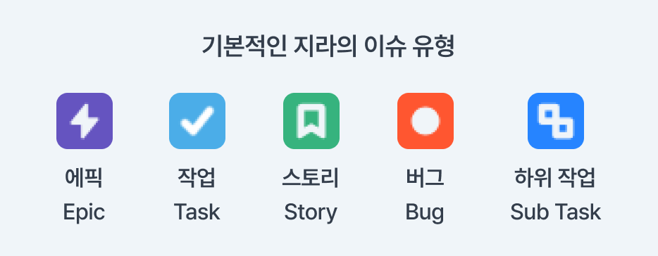 지라는 기본적으로 5가지 이슈 유형을 제공한다. 이는 애자일 원칙에 기반을 두고 있기 때문이다. 각 유형의 정의는 아래와 같다.