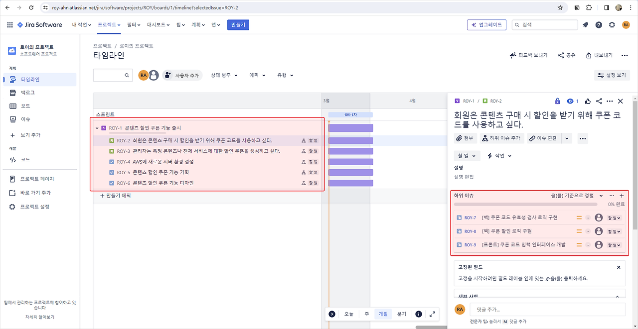 - 스토리, 작업 하위에 하위 작업을 연결한다.