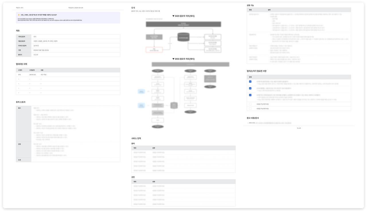 요즘엔 피그마로 '기획서 키트'를 만들어 테스트 중이다. 기획서에 들어갈만한 요소(속성)를 컴포넌트화하고, 오토 레이아웃을 사용해 템플릿처럼 사용하는 형태다. 피그마 팀 라이브러리를 활용할 수 있고 구성원이 피그마를 일정 수준 이상 활용할 수 있어야 한다는 과제가 있다.