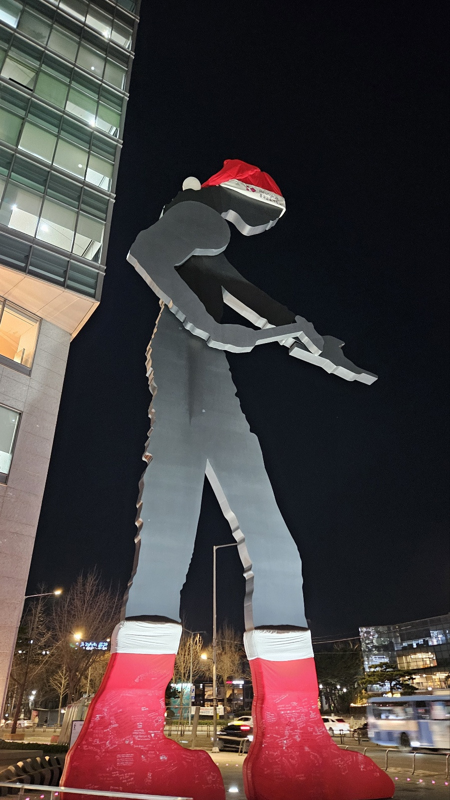 (이 조형물의 이름은 'Hammering Man'이다. 미국 조각가 Jonathan Borofsky의 작품으로, 독일 프랑크푸르트, 스위스 바젤, 노르웨이 릴레스트룀 Lillestrøm, 미국 시애틀 등 여러 곳에 전시돼있다. 서울에 위치한 이 22m 높이 Hammering Man이 세계 최대 Hammering Man이라고 한다. Hammering Man은 전 세계 노동자를 상징한다고 한다. 평일 오전 8시부터 오후 6시까지 35 초마다 쉬지 않고 망치질을 하는데, 주말과 공휴일에는 쉰다고 한다. 광화문 회사원의 삶을 사는 미국인 친구...)