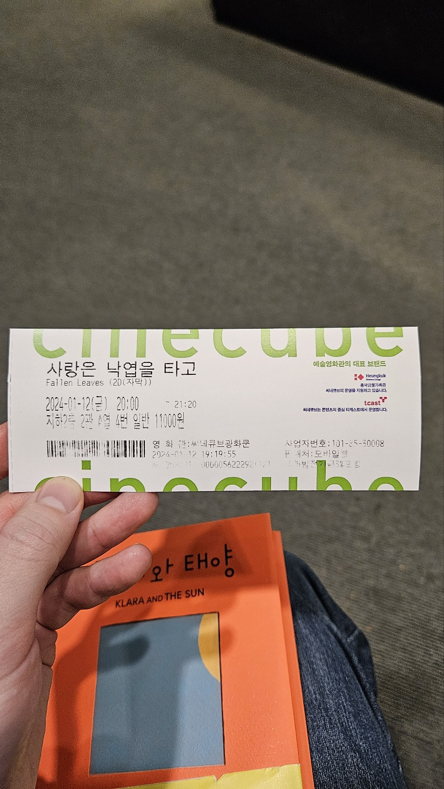 영화 티켓. 나는 혼자 영화 보는 걸 좋아한다.알코올 중독을 앓고 있는 것으로 보이는 남자, 홀라파. 어느 날 그는 동료 노동자의 권유로 함께 노래방과 바가 결합된 듯한 곳인 핀란드식 '가라오케'를 찾는다. 홀라파는 이곳에서 안사를 만난다. 둘은 오래 시선을 교환한다. 둘의 인연이 시작된 것이다. 둘은 우연히 다시 만난다. 안사가 일하는 바 앞에서. 그들은 카페에서 커피를 마신다. 홀라파는 카페에서 힙 플라스크에 담긴 술을 커피에 타 마신다. 심각한 알코올 중독자가 아닐까. 이후 둘은 영화를 보러 간다. 영화는 짐 자무시(Jim Jarmusch) 감독의 '데드 돈 다이'(The Dead Don't Die). 애덤 드라이버의 얼굴이 화면에 나온다. 극장에서 나온 홀라파는 안사에게 이름을 묻는다. 안사는 다음에 알려 주겠다고 답한다. 안사는 종이에 자신의 번호를 적어 홀라파에게 준다. 안사와 헤어진 직후에 홀라파가 주머니에서 담배를 꺼낼 때 그 종이는 주머니에서 나와 거리에 떨어진다. (담배가 문제다.) 이름도 모르고 번호도 모르는 안사를, 홀라파는 다시 만날 수 있을까? 핀란드의 수도이자 최대의 도시인 헬싱키에서. 인구가 67만 명이 넘는 헬싱키에서 말이다.