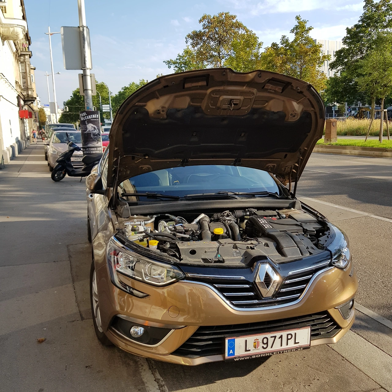 그런데, 몸이 기억하기에는 두 가지 큰 문제가 있었다. 일단 클러치가 너무 깊게 눌리는 차였고, 두 번째는 자동 시동 끄기 옵션이 설정되어 있어서 정차 중 시동이 꺼지고 클러치를 떼거나 액셀레이터를 밟으면 시동이 다시 자동으로 걸렸다. 자동 차량에서는 편한 이 기능이 오랜만의 수동 운전에서는 깊은 클러치와 함께 나를 혼란에 빠트리더니 시동 꺼짐이 무한히 계속 반복되었다. 빈 도심 한가운데서 녹색 신호가 켜졌는데도 나는 앞으로 나가질 못하고 삐질 땀을 흘리며 겨우 차를 움직여 가고 있었다. 그러던 중 어떤 오토바이 한 대가 바로 옆에 붙더니 창문을 툭툭 치는 게 아닌가! 온 신경을 클러치를 누르는 발과 수동기어를 조작하는 손에 집중하고 있어서 옆을 돌아보기도 어려웠다. 게다가 유럽에서 벌써 치한을 만난 건가?라는 생각에 갑자기 식은땀이 쏙 들어가고 냉기가 느껴지기까지 했다. 그래도 일단 차 안에 있으니 안전은 하겠지라며 정신을 차리고 바라보니 무언가를 말하려 하고 있었다. 동시에 뭔가를 가리키는 듯한 손가락을 따라 시선을 보닛으로 가져가 보니 글쎄.. 우리 차에서 연기가 나고 있는 게 아닌가! 빨리 갓길로 차를 대라는 와이프와 딸의 비명 소리에 일단 길가 노상 주차 구역에 차를 겨우 주차시켰다. 보닛을 열어보았으나 알 수 있는 건 진한 플라스틱 녹는 냄새가 난다는 것.