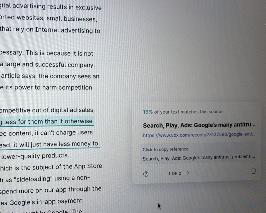 저는 Grammarly 라는 영어 첨삭 사이트를 구독하여 돈을 내고 프리미엄 서비스를 이용하고 있습니다. 프리미엄 서비스에서는 표절률(Plagiarism)검사 서비스를 제공하여 과제 제출 전에 확인하고 제출하는데 Grammarly에서는 13% 인 것을 확인했었습니다. (일반적으로 20% 미만으로는 허용해주고 있습니다)