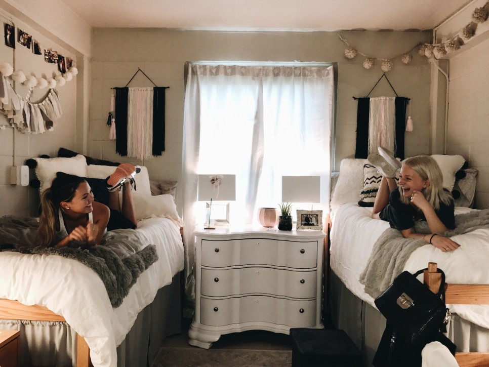 제가 이 사진을 고른 이유는, 딱 이 사진이 미국 20살의 대학 기숙사 모습을 보여주는 것 같아서입니다. 일단 신발을 신고 침대에 올라가 있고, 침대가 상당히 높은 편(오른쪽, 침대 높이를 조절할 수 있습니다), 치렁치렁 달아 놓은 장식, 그리고 천정에는 조명이 달려 있지 않고 선반 위에 간접 조명이 있지요.