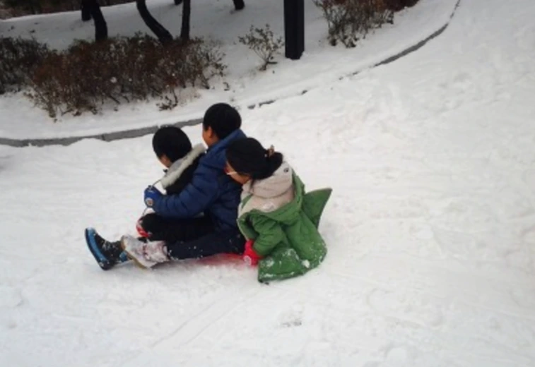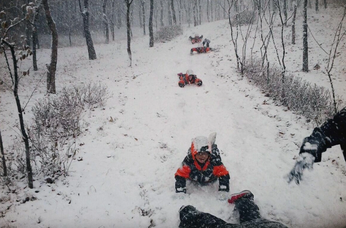 아마도 짜릿하면서도 아이들이 가장 즐거워하는 것은 눈에서 미끄럼을 타거나 눈썰매를 타는 것이다. 오랫동안 아이들과 눈 놀이를 하다 보면 아이들도 노는 방법을 터득한다. 눈이 오는 것을 보며 산에 올라갔는데 너무 많이 쌓이는 경우가 있다. 눈썰매가 준비되어 있지 않아서 좀 아쉽다 할 때에는 아이가 그냥 패딩을 입은 채 배를 깔고 비탈을 내려가면 된다고 해서 한번 해봤는데 도구를 사용하는 것보다 방향감각도 잘 잡을 수 있고 눈 위에서 옷도 상하지 않아 즐겁게 놀은 경험도 있다.