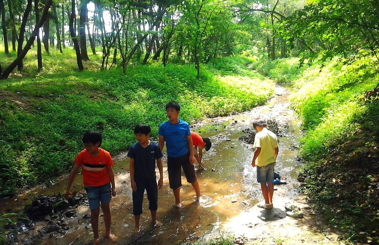 아이들은 돌을 찾아 던져 보기도 하고 소리를 질러 보기도 하였는데 개구리가 한 마리 뛰어나왔다. 아이들은 숲의 매미소리를 들으며 물속에서 사는 가재며 송사리들을 찾았고 돌이 발에 닿는 느낌도 느껴보고 돌을 찾아 돌팔매도 던져 보면서 즐거운 시간을 보낸다.