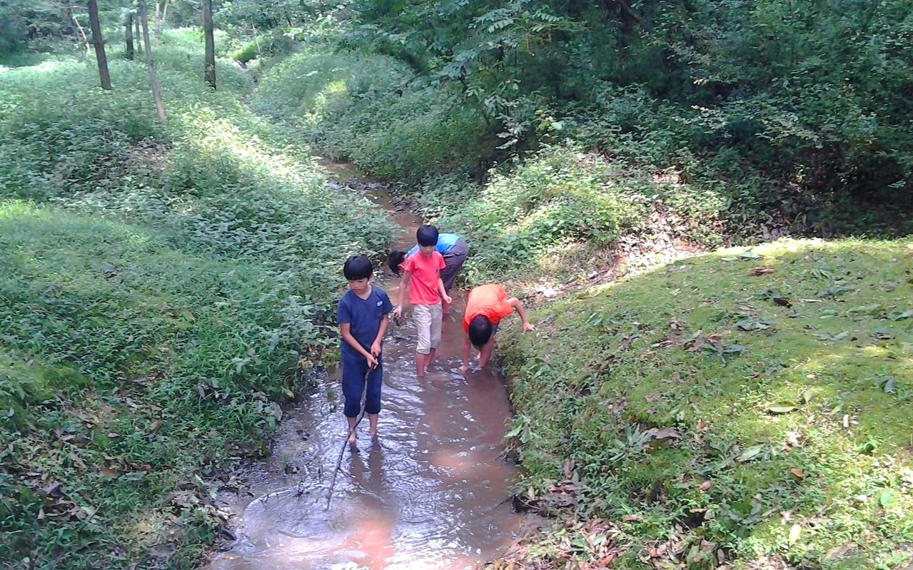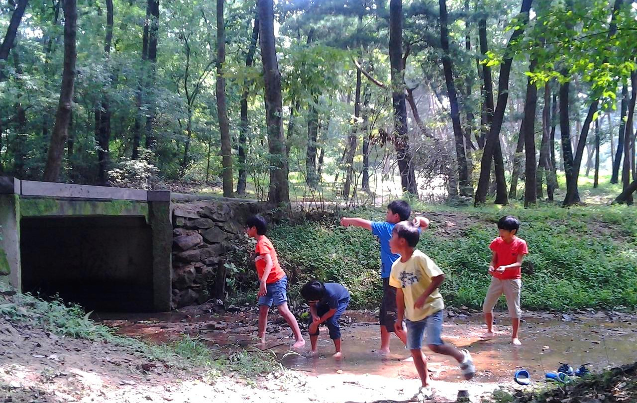 울창한 숲길을 걷다 물이 흐르는 냇가를 보고 아이들이 그냥 갈리는 만무다. 아이들은 물속에 무엇이 살고 있다는 것을 알고 있기 때문에 물에 들어가 무엇인가를 찾으려고 한다.