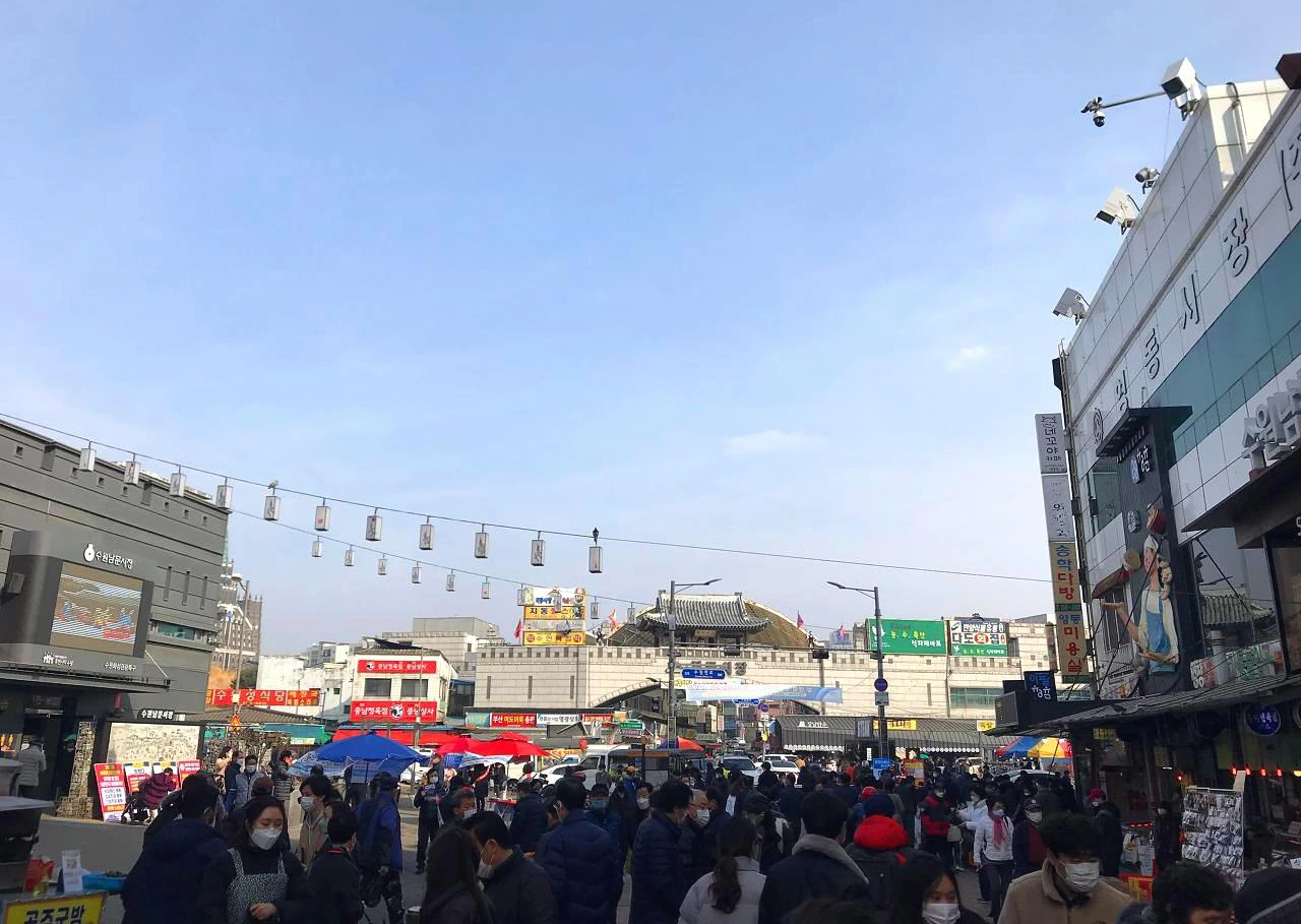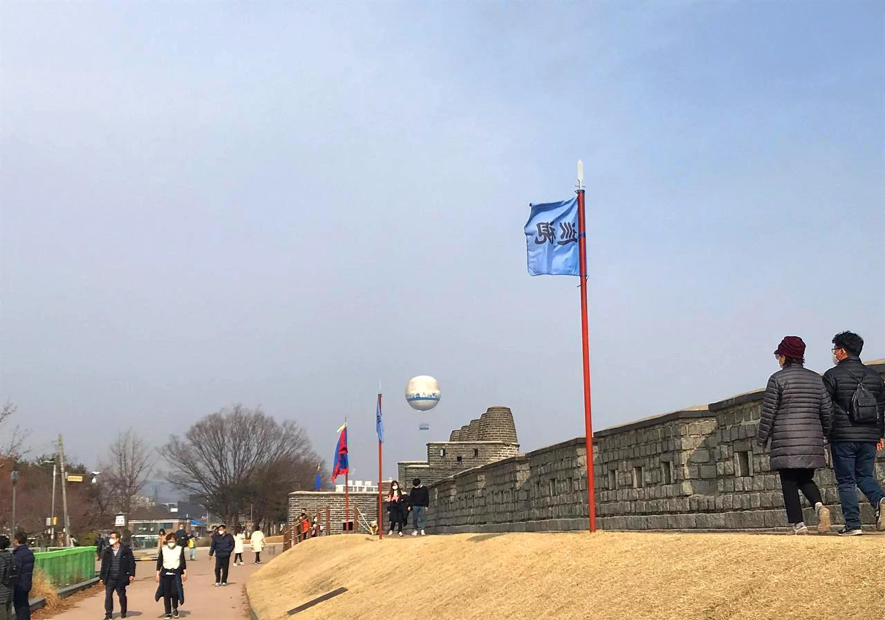 코로나 19로 가정에서 5인 이상 집합 금지, 설 명절을 오고 가지 말 것을 강요했는데도 시장에 물건을 사러 나온 사람들이 발 디딜 틈도 없이 많이 나왔다. 사람들 사이를 비집고 나와 성곽으로 올라갔다. 멀리 보이는 누각 사이 성벽길에는 오고 가는 사람들이 많이 보인다.