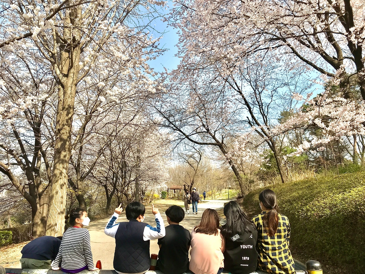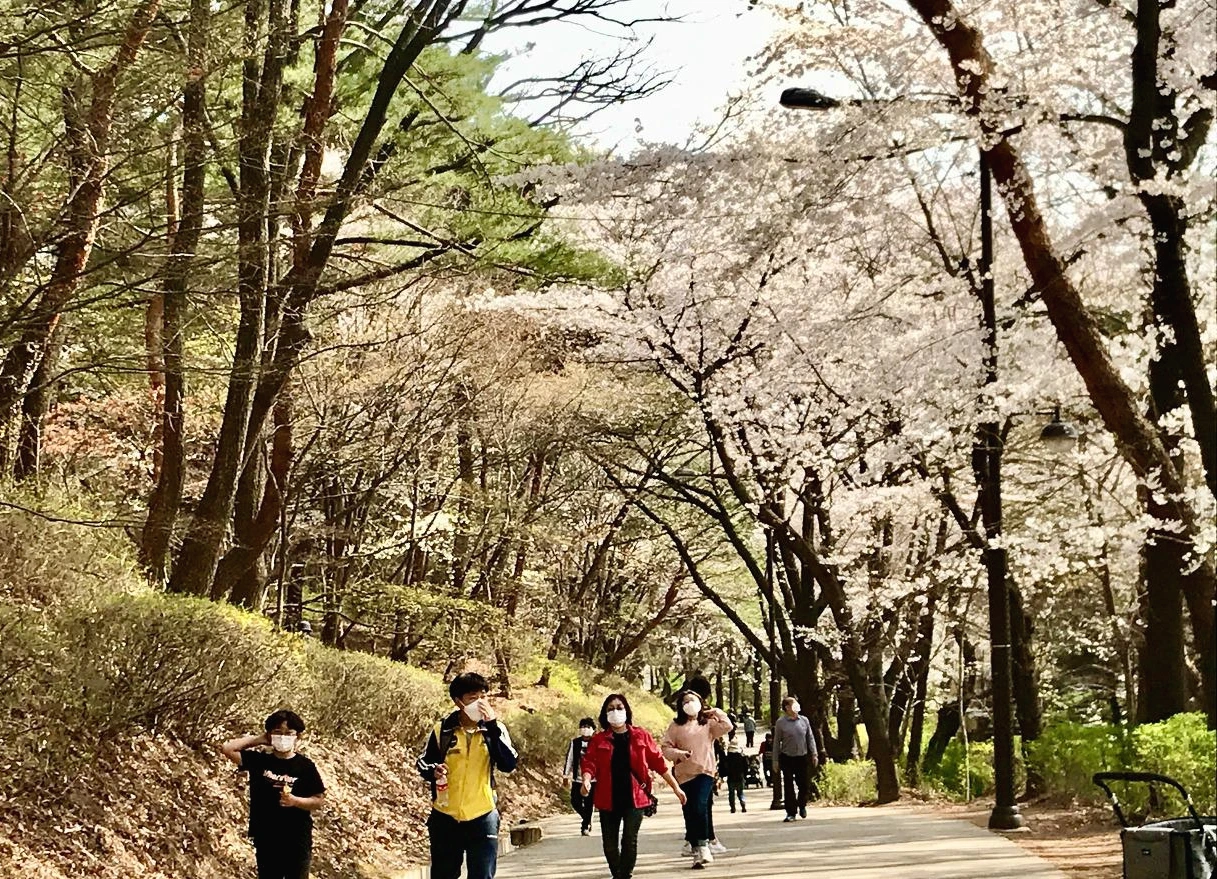 산을 올라가며 아이들이 덥다고 해서 준비해온 아이스크림을 하나씩 나눠줬다. 이곳은 어젯밤에 보았을 때 벚꽃이 가장 예쁘게 피어서 이곳으로 내려가는데 먼저 내려간 아이들은 꽃이 만발한 곳에 띄엄띄엄 떨어져 앉아서 아이스크림을 먹으며 꽃을 감상하기도 하고 말장난을 하기도 한다. 코로나가 무서운 아이는 멀리 떨어져 앉아서 혼자 먹고 친구가 좋은 아이는 눈 맞출 정도의 거리에 앉아서 연신 생글거린다.