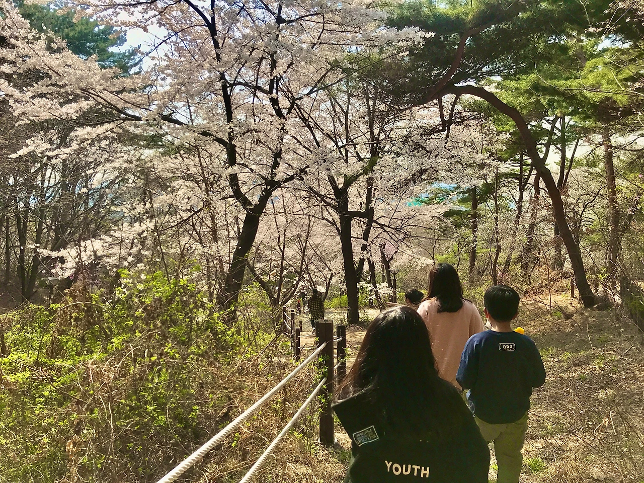 아이들은 수양벚꽃 앞에서 넉을 잃을 만큼 황홀해하며 사진도 찍고 참새들의 지저귀는 소리와 벚꽃을 구경 나온 인파의 소음이 섞여 싫었는지 산으로 올라가자고 한다. 산으로 오르는 길도 벚꽃이 만개해서 아이들은 환호를 지르고 길가 주변에 새싹들을 보면서 이것은 무슨 나무냐고 물어본다. 우리가 오르는 길가엔 원추리가 초록 새싹이 예쁘게 돋아나 있고 길가엔 화살나무와 귀룽나무에 새싹이 파릇파릇 피어있나고 꽃망울도 보였다.