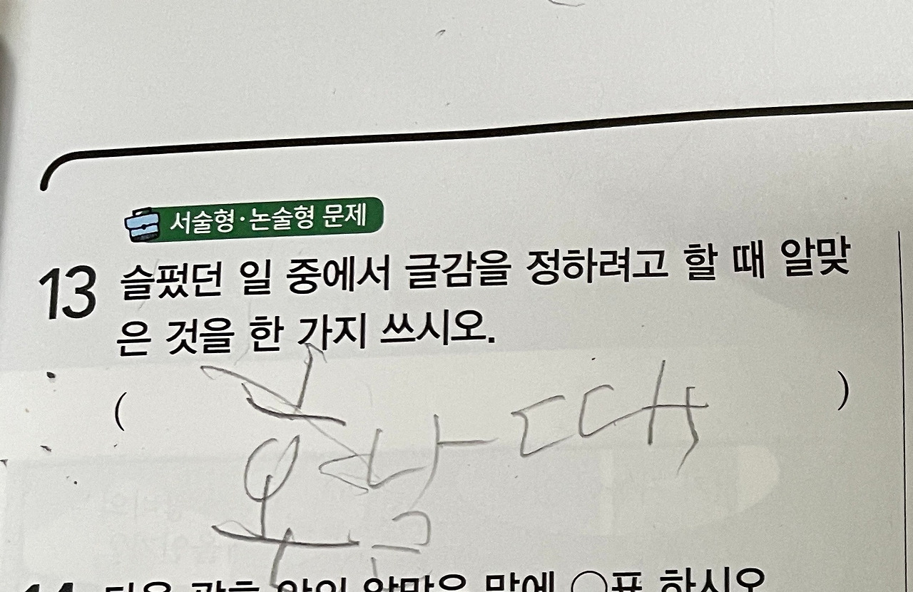아이가 문제를 풀면서 너무 힘들다고 해서 문제를 보며 글씨 쓰기가 어려워서 쓰는 것이 힘드냐고 물어봤더니 아니라고 하면서 이문제의 답을 어떻게 써야 할지 몰라서 그런다며 너무 힘들다고 했습니다. 슬펐던 일 중에서 생각해서 써보라고 했더니, 아이는 살면서 슬픈 적이 없었다고 하며 슬픈 것을 생각해 내는 것이 힘들다고 했습니다.