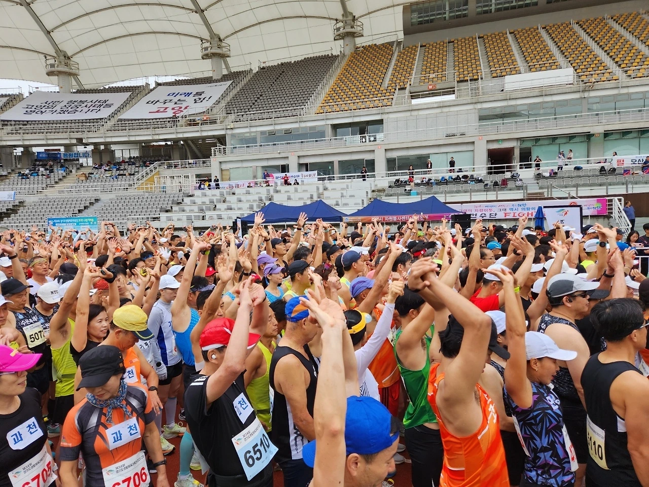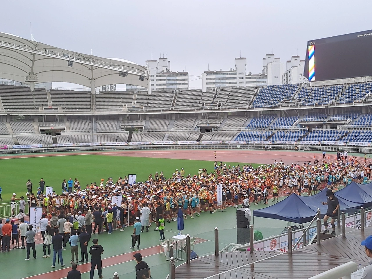 고양시에 도착해서 우리 시에서 준비해 준 유니폼을 입고 달리기 준비를 위해 스트레칭도 하고 트랙을 돌며 연습을 학고 아침 8시에 마라톤이 시작되었다.