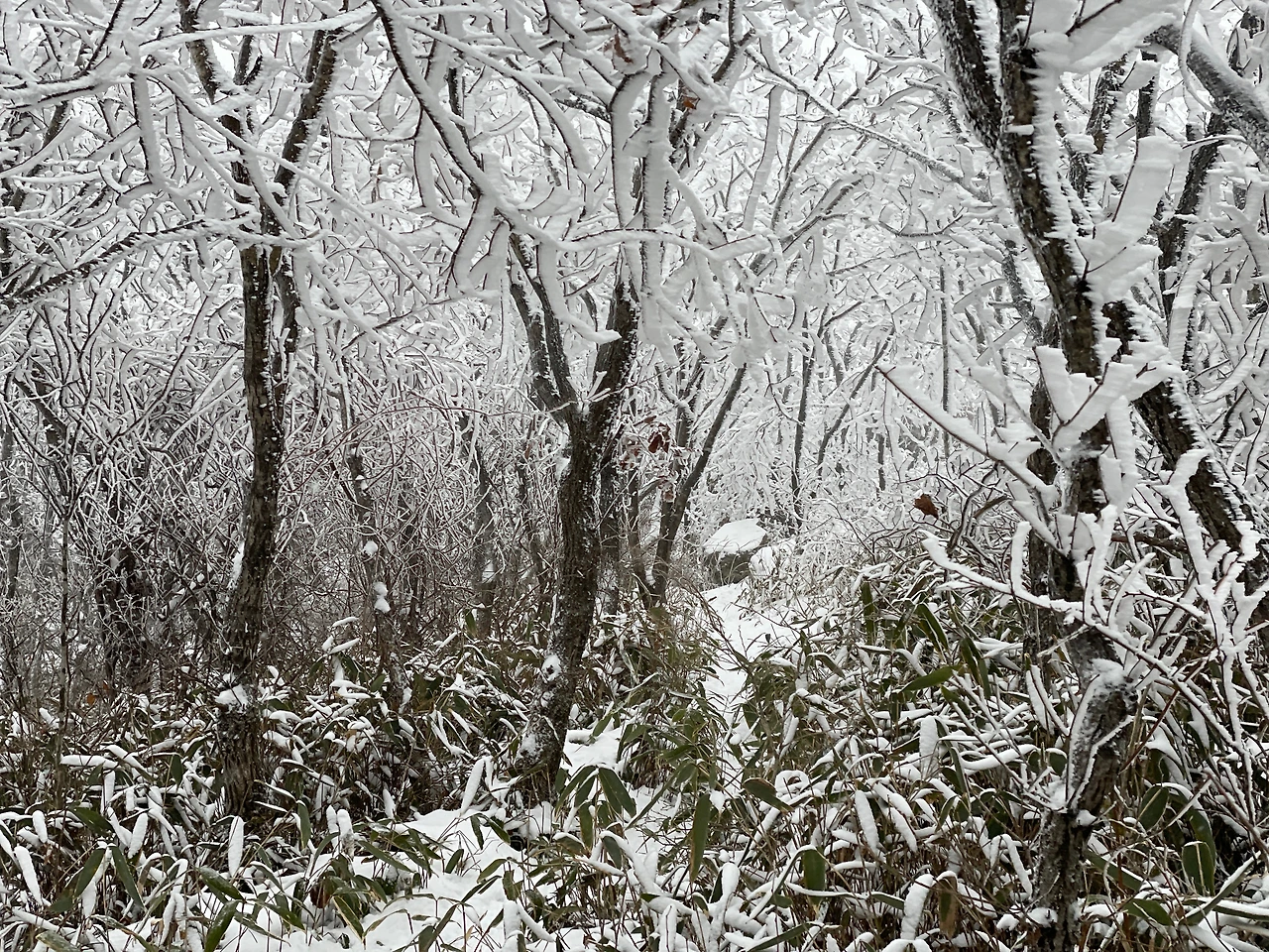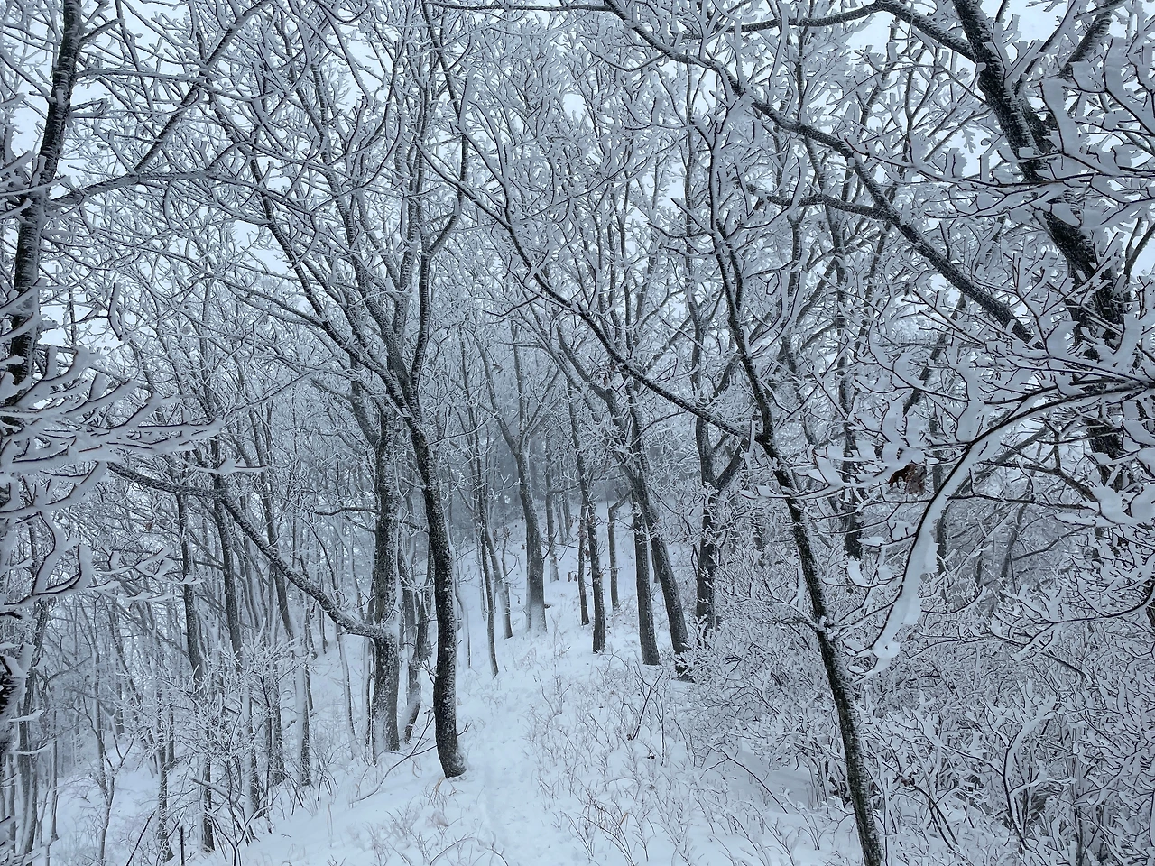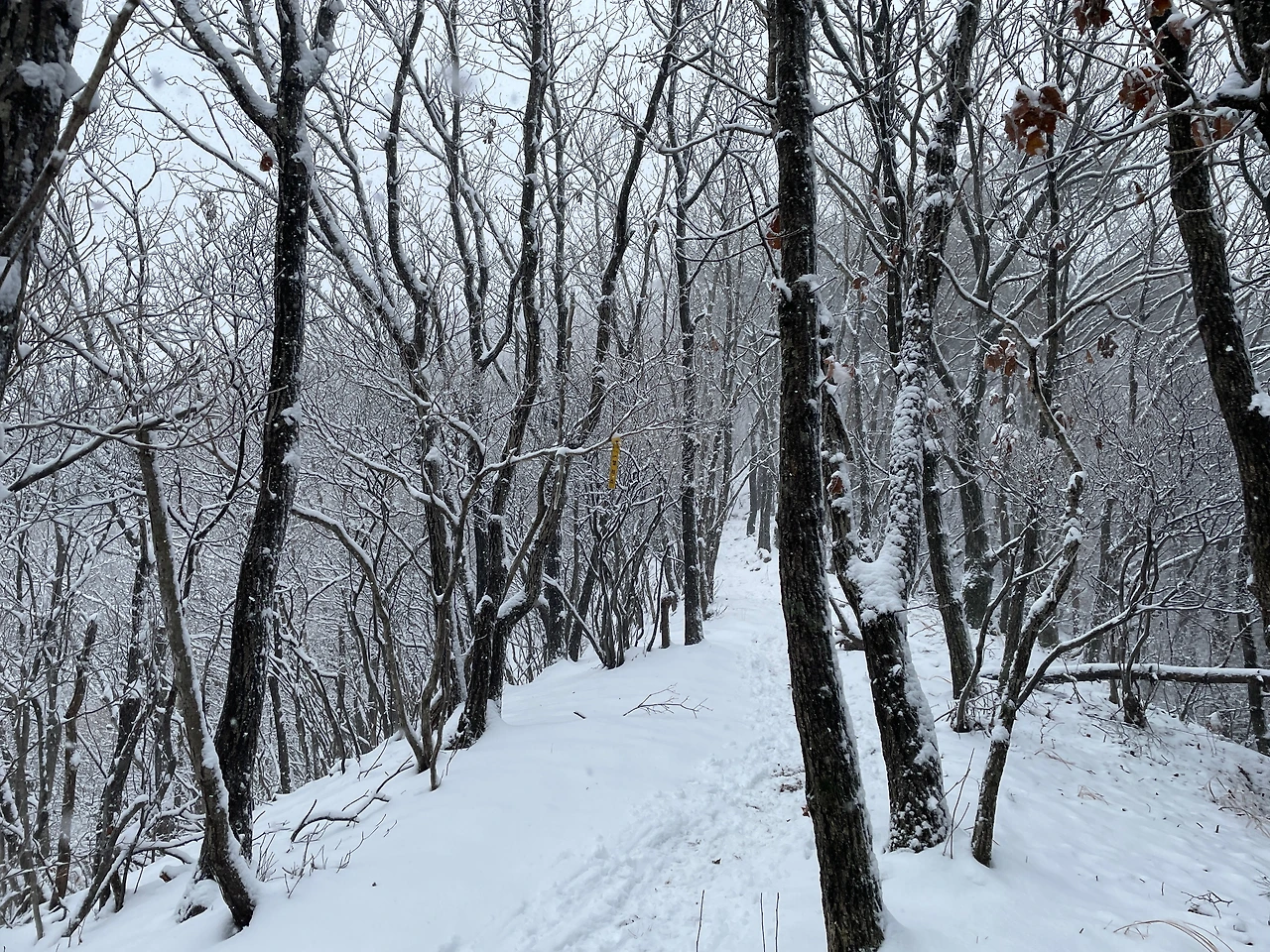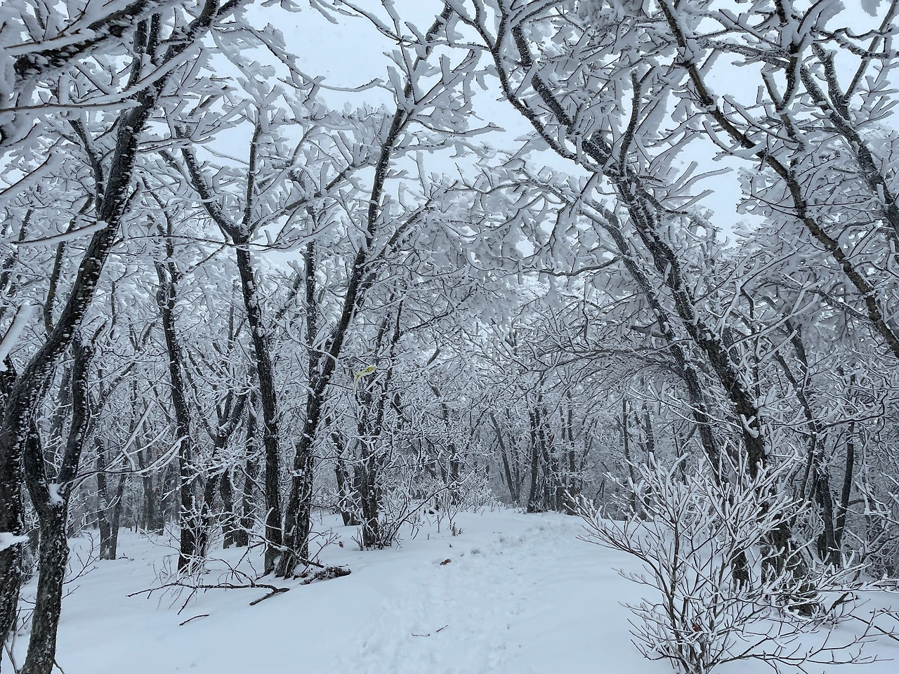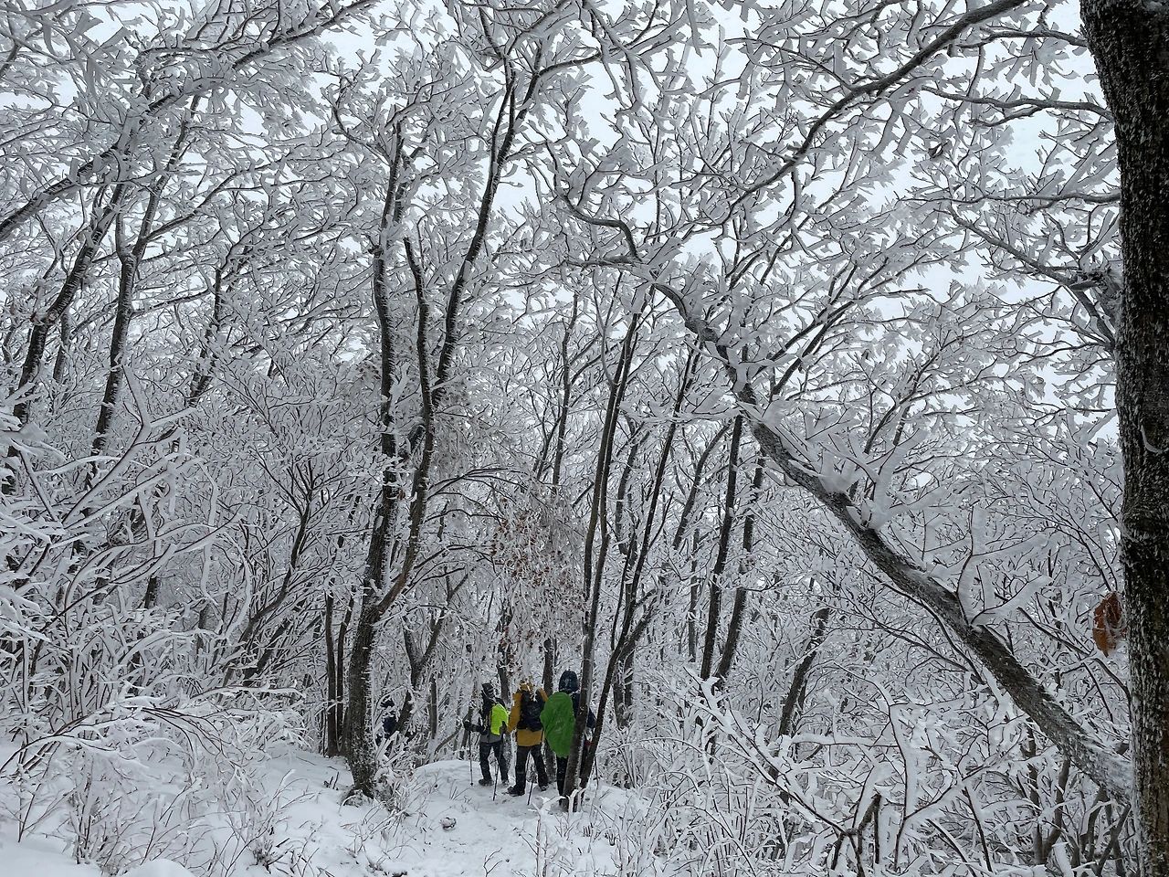 덕산재에서 부항령까지는 높지도 힘들지도 않은 눈 내리는 아름다은 숲 구간이었는데 10시간이 넘는 산행에서 너무 지루했다.