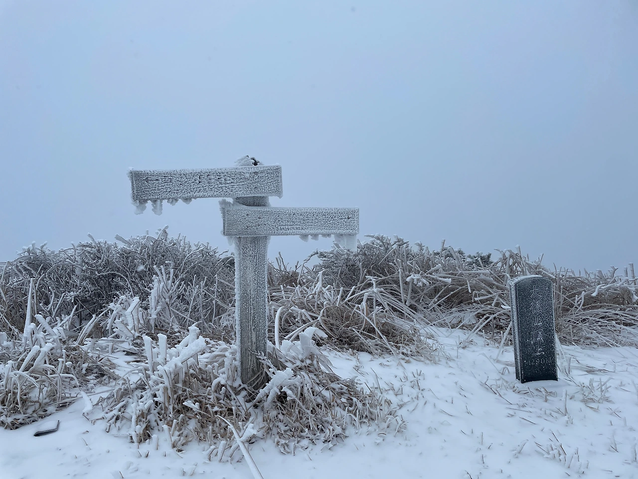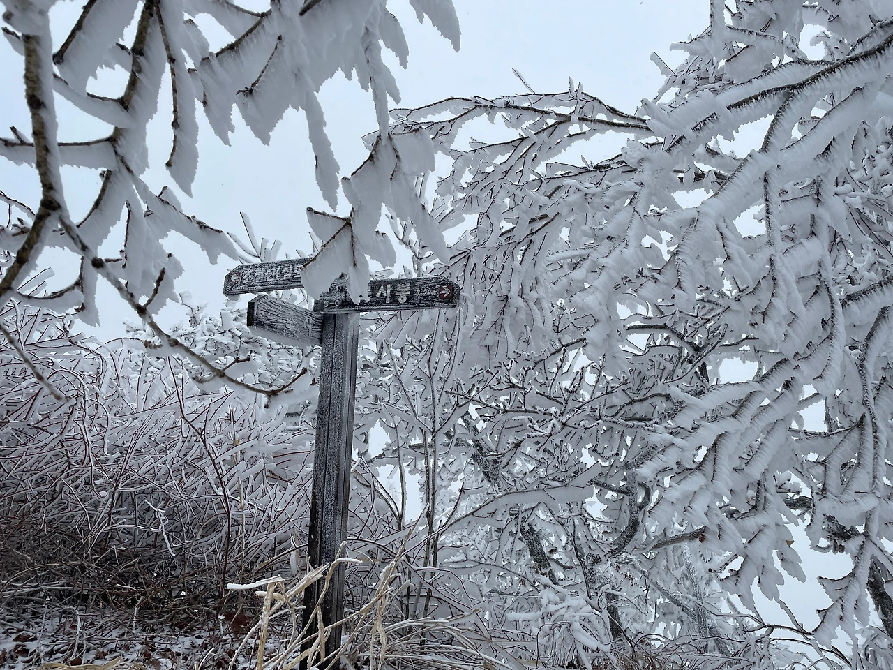 산정상의 표지판도 꽁꽁 얼어붙어 이정표를 볼 수없다.