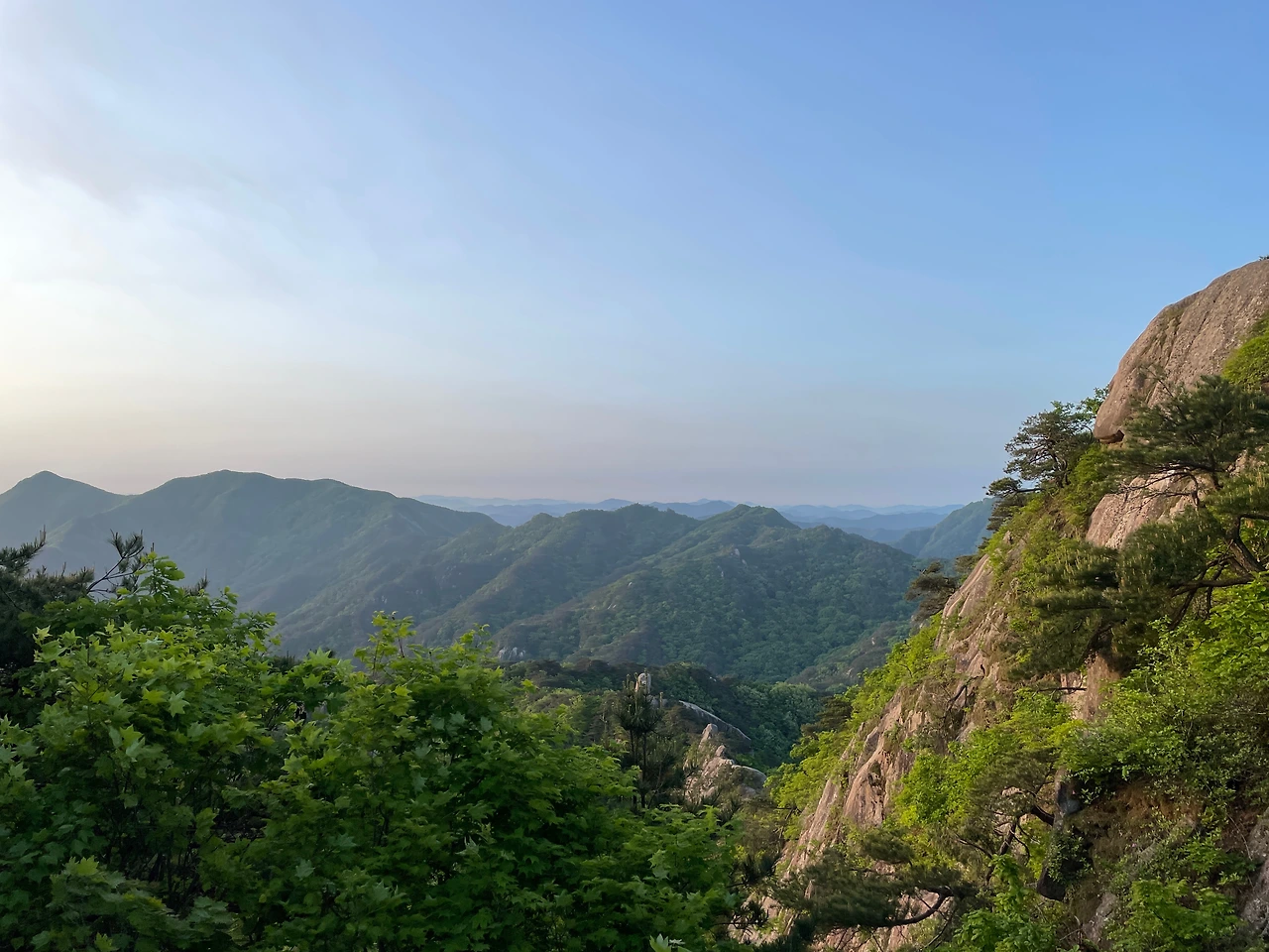 바위를 올라가 뒤를 돌아보았을 때 우리의 산하는 지금껏 고생한 산행의 흔적을 싹 씻는 듯 마음을 확 트이게 했다.