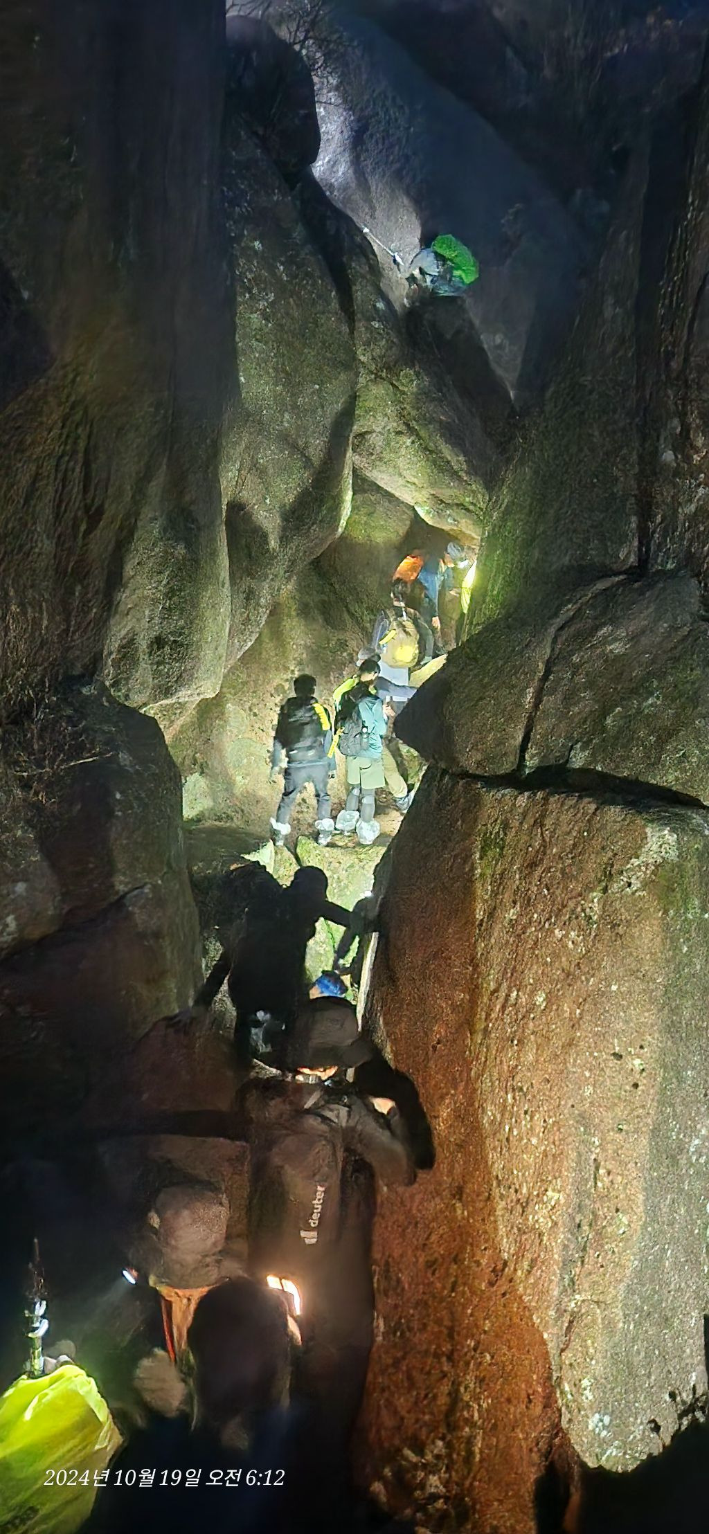 어둠 속에서 꼭 서바이벌게임을 하는 것 같았다. 비는 오지 않았지만 우리가 오기 전까지 비가 내려서 바위가 촉촉이 젖어있었다. 온몸을 비틀고, 있는 힘을 다해 벗어나며, 바위에 올라가고, 내려가기와 밧줄을 잡고 올라가고, 내려가는가 하면, 좁은 틈새를 빠져나가야 하는 암능길을 다 빠져나가는 순간까지 있는 힘을 다 쏟은 듯 팔다리가 힘이 없었다.
