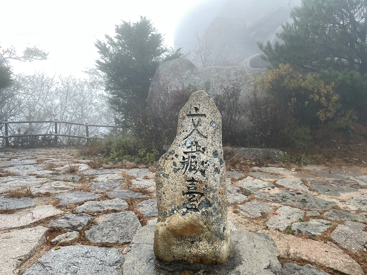 문장대에 올라갔더니 선두에 올라가던 대원들이 앉아서 식사를 하고 있었다. 함께 간식을 먹고 사진도 찍고 주변을 살펴보았을 때 안개가 심해서 아무것도 보이지 않았다.
