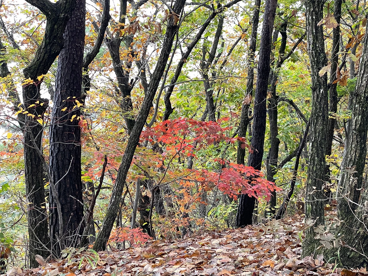 문장대에서 천왕봉으로 내려가는 길에 무릎이 힘든 것 같아 며칠 전에 구입한 일자형 무릎보호대로 무릎아래쪽에 착용하는 동안 동료들은 앞으로 가고 천천히 걸었다. 날씨가 좋은 날은 사진 찍으러 오겠지만 흐리거나 비가 오는 날은 출사를 하지 않는 것을 생각하며 휴대폰을 꺼내 사진을 찍기 시작했다. 안갯속에 아무것도 보이지 않는 풍경을 찍으며 갈 때 속리산 풍경이 순식간에 안개가 걷히며 보였다. 간간이 보이는 단풍도 구경하며 걸었다.