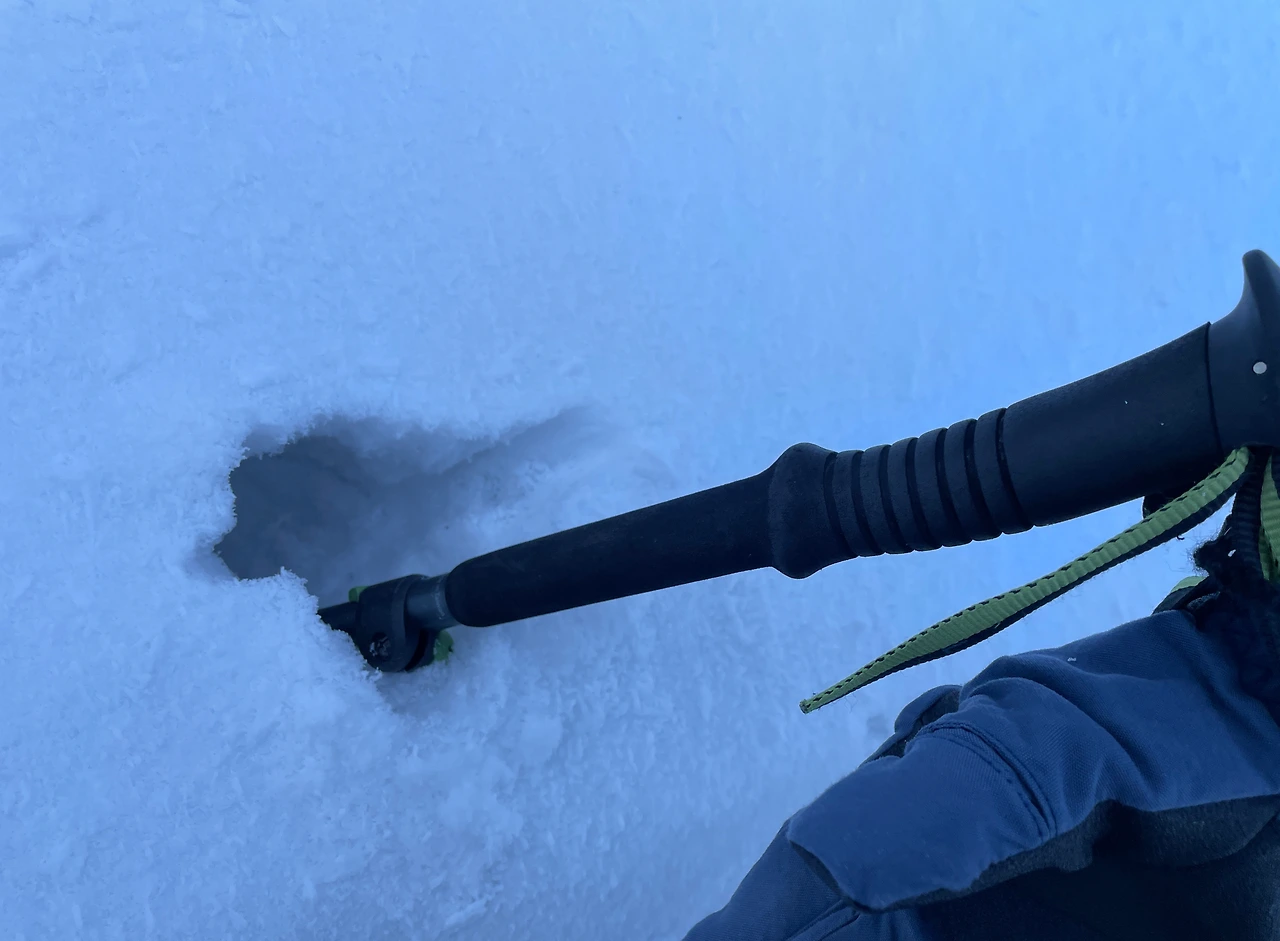 왼쪽 스틱이 눈 속에 깊이 박혔다.