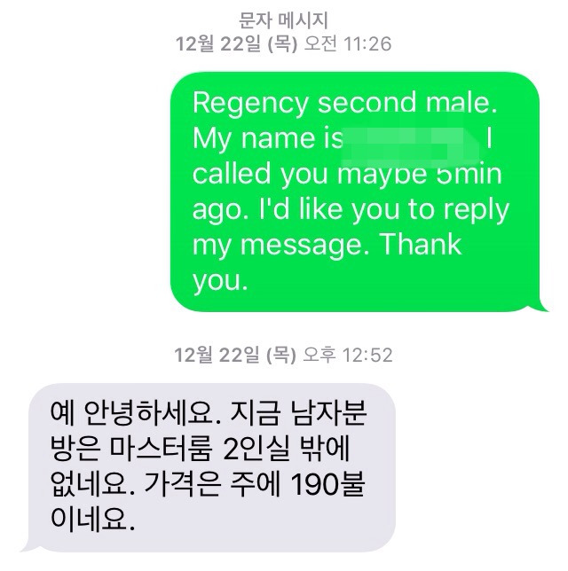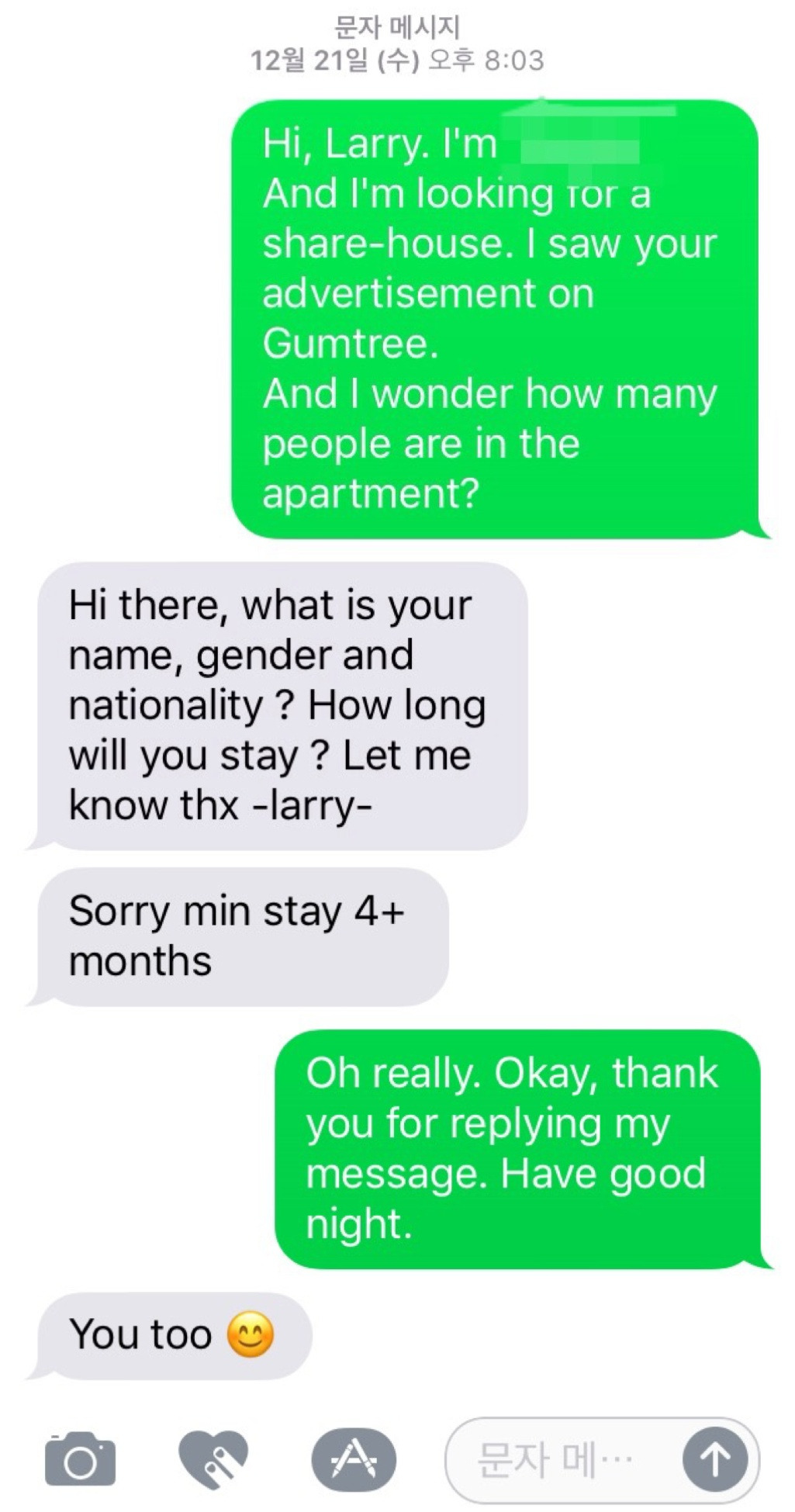 방을 찾아보면서 웃긴 일이 있었는데, Gumtree에서 셰어생을 구한다는 글을 보고서 심혈을 기울여 한 땀 한 땀 단어를 골라 겨우 문자를 보냈는데, 답장으로 '예 안녕하세요"라는 답장을 받았다. 아니 한국인 티 나도 조금 모른 척해주시지 ㅎ. 하기사 내가 이름을 보냈으니 그럴 만도 하다는 생각이 든다.