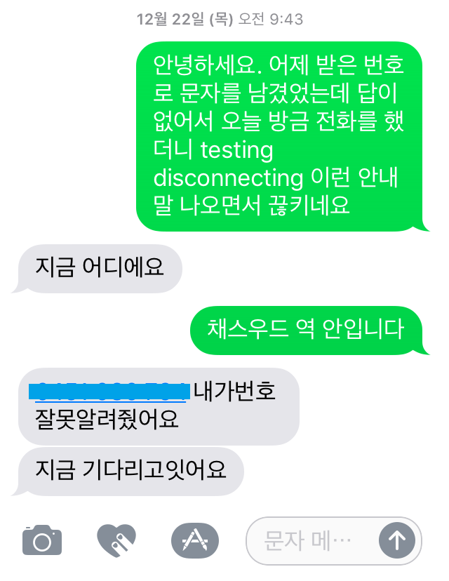 이제는 문자가 아니라 바로 전화를 걸었다. 부랴부랴 몇 군데 전화를 걸어봤지만 이미 방이 나갔거나 지금은 인스펙션이 안된다는 답변뿐이었다. 더 이상은 아니다 싶어 떠날 채비를 하는데 처음 약속 되었던 그 집 아주머니로부터 연락이 왔다. 번호를 잘못 알려줬다고 한다.