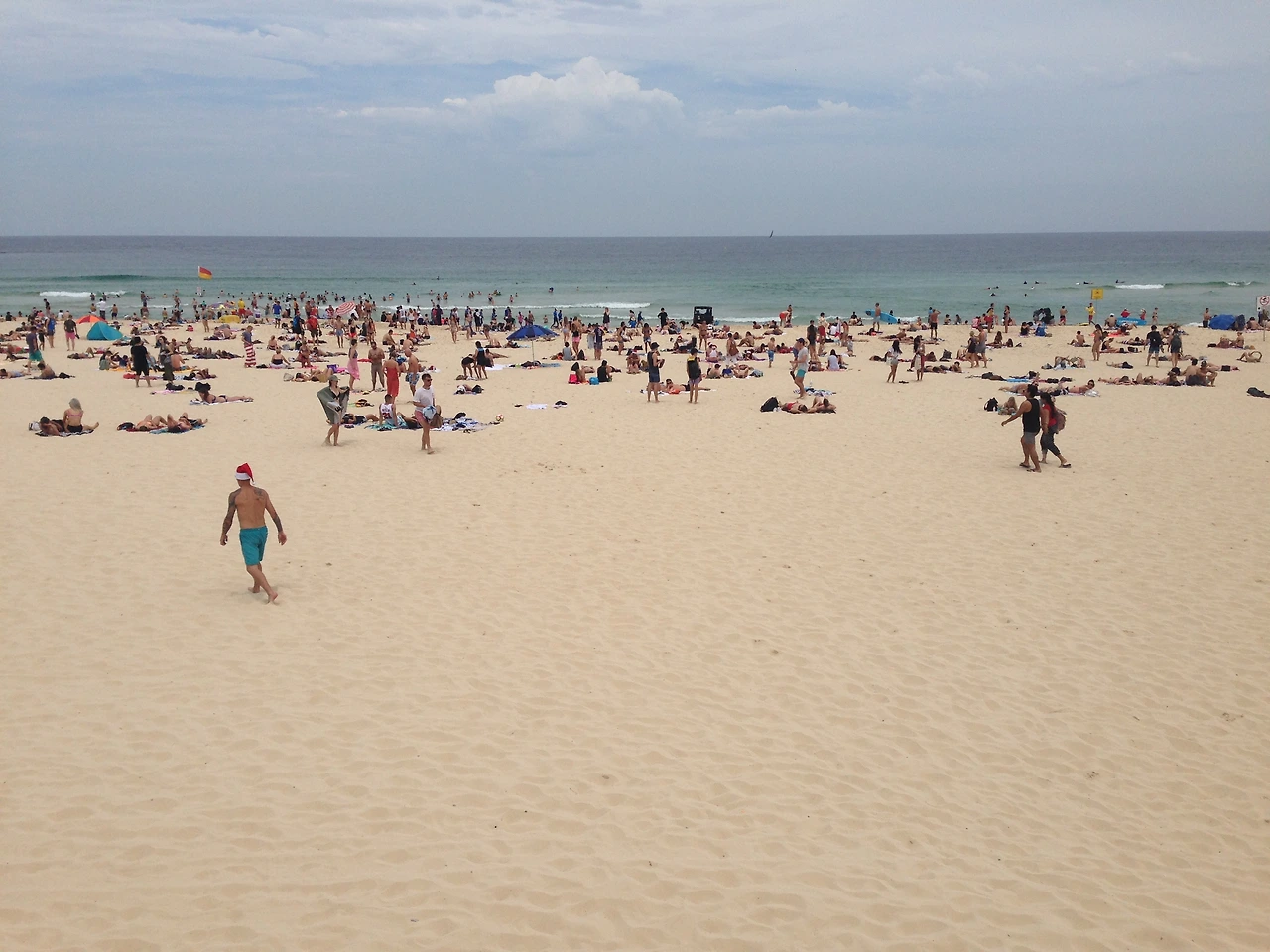 Bondi beach에 도착하며 아침부터 시작된 Coastal walk trekking이 막을 내리게 되었다. 호주를 오고 나서 참 많이 걷는다는 생각이 든다. 길을 헤매서 걷기도 하고, 차비 아끼려고 걷기도 하고, 이제는 자발적으로 땡볕 아래서도 걸었으니 말이다. 해안산책로를 거닐며 봤을 때 주로 가족 단위 여행객이 많이 보였고, 크리스마스는 크리스마스인지 수영복 차림에 산타모를 쓴 사람이 간간이 보였다. 사람도 워낙 많아서 발 담그기는 미루기로 하고, 잠시 모래사장을 걷다가 돌아가기로 했다. 아참! 기대했던 비키니 산타는 찾지 못했다.