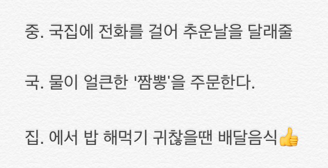 전국적으로 폭우. 폭설이 내리는 지금. 저는 짬뽕이 정말 땡깁니다. 저녁으로 먹은 짬뽕을 사진으로 올리고 싶었지만. 사진으로 보여드리는게 무슨 소용인가요. 직접 얼큰하게 먹어야 진짜 짬뽕이죠ㅎㅎ