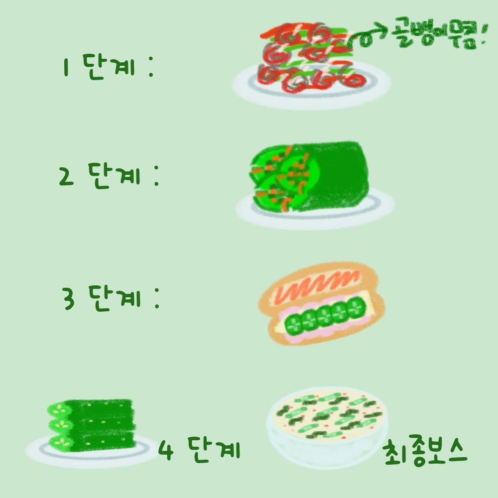 아직은 2단계까지 클리어하였다 과거의 내가 어떻게 오이냉국을 먹었는지 모르겠다 그동안 얼마나 채소를 멀리 했는지 체감하게 된 계기였다 그런 만큼 단계 단계 차근히 레벨 업하여 최종 보스까지 꼭 클리어해야겠다!