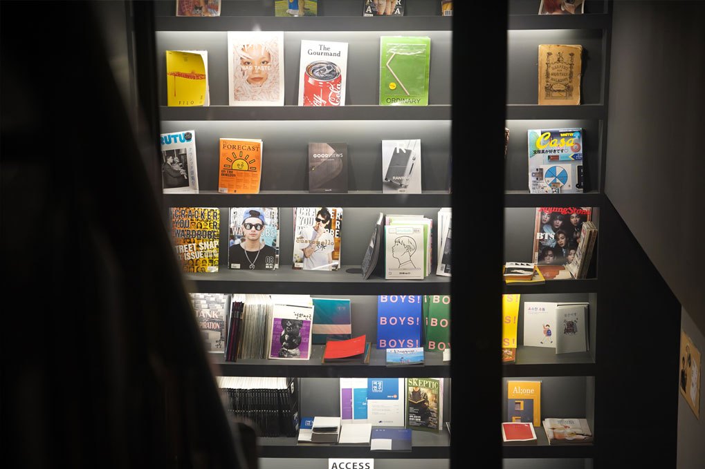 반계단 내려가면 공간의 통창 너머 서가 안에 가지런히 진열된 잡지들이 저마다 개성 있는 표지를 드러내고 있습니다. 걸음을 늦추고 저 다채로운 표지 안에는 어떤 이야기들이 담겨있을지 상상하면서 호기심과 기대감을 간직한 채 발걸음을 계속 옮겨봅니다.