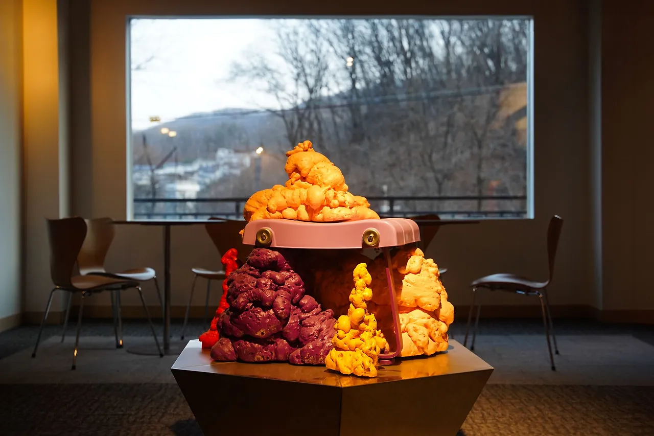 A 1층은 이질감의 전부이자 시작이었요. 입구 문이 열리면 카운터 너머로 보이는 암벽도 이질감의 시작으로 의도한 부분이었고 곳곳에 놓인 전시 작품도 마찬가지예요. 보시면 그냥 아크릴폼이거든요. 아크릴폼은 건축적으로도 미술적으로도 형편없는 기능을 가진 소재인데, 작품이라는 프레임을 갖고 있기 때문에 평소와 다른 개념으로 와닿게 되어 이질감을 더해주게 돼요. 그렇게 익숙하고 편안한 분위기인 2층과는 확실한 대비를 주어야 더 깊은 여운을 남길 수 있을 거라고 생각했어요.