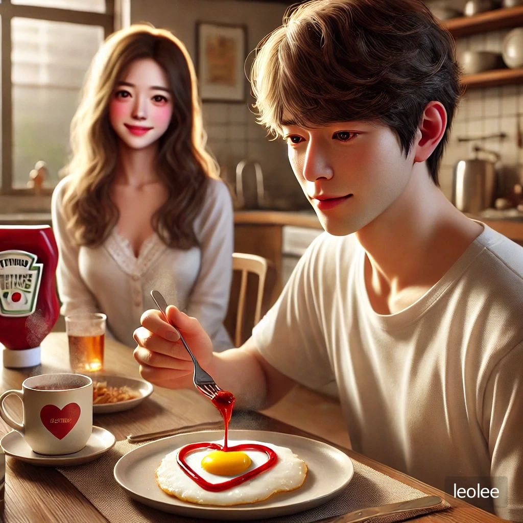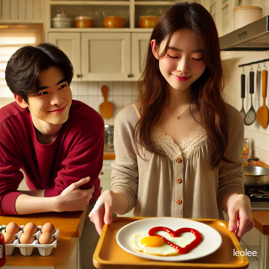 “계란 프라이가 이렇게 로맨틱할 수 있다니!” 내가 농담을 던지자, 씨씨는 얼굴이 빨개지며 말했다.