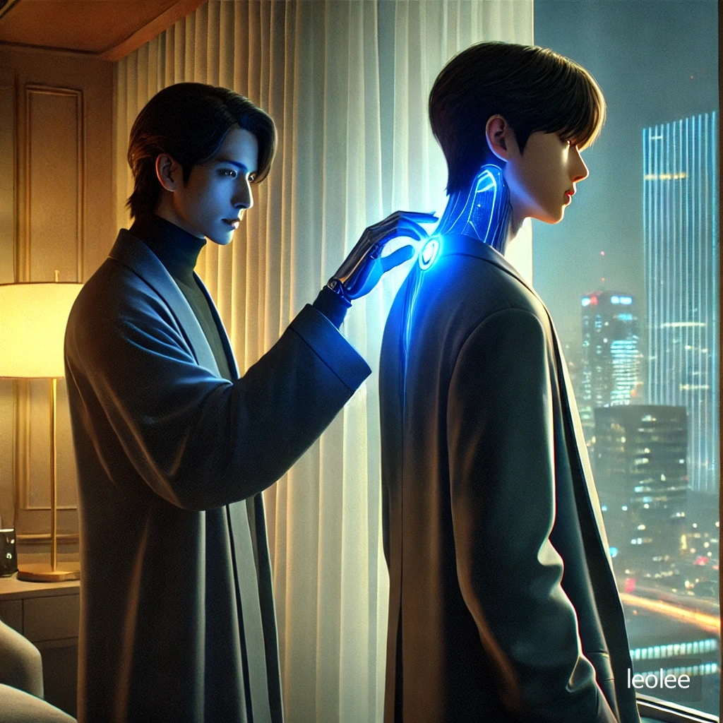 며칠 후, 이준호는 민준과 마주했다. 민준은 호텔 방 창가에 앉아 있었다. 바깥의 불빛이 희미하게 방 안으로 스며들고 있었고, 그의 손끝에는 캡슐이 있었다. 캡슐은 목 뒤에서 희미한 푸른빛을 내며 미세하게 진동하고 있었다.