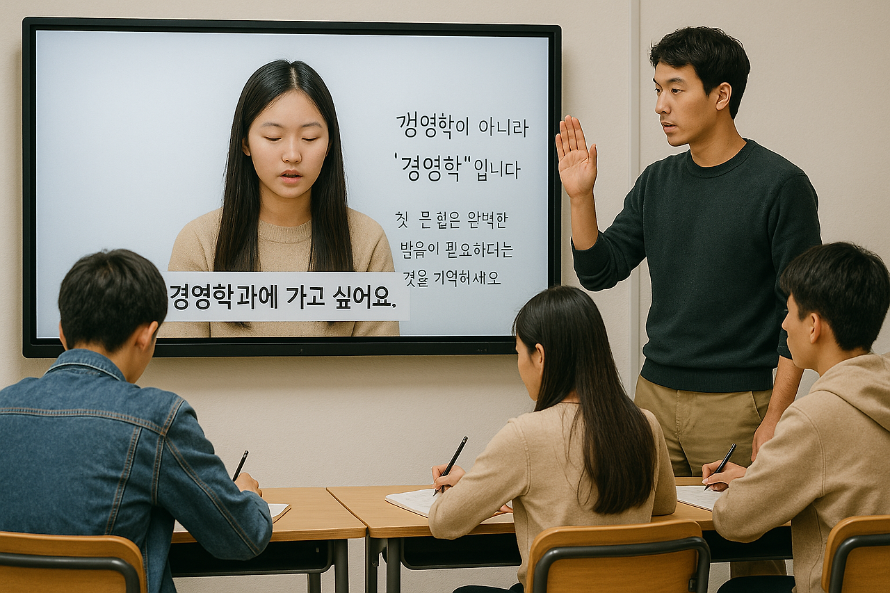 메이린은 또박또박 읽으려 했지만, ‘경영학’의 ‘경’ 발음을 ‘갱’으로 잘못 굴렸다. 모두가 영상에서 그 부분을 보자, 나는 멈추고 말했다.