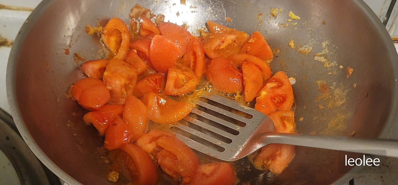 이제 웍에 토마토를 넣고 볶는다. 토마토가 더 말랑말랑해질 때까지 천천히 저어준다.