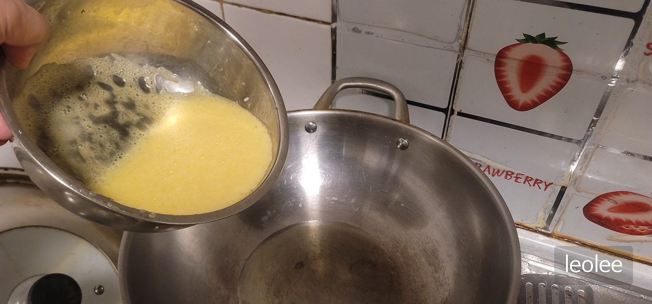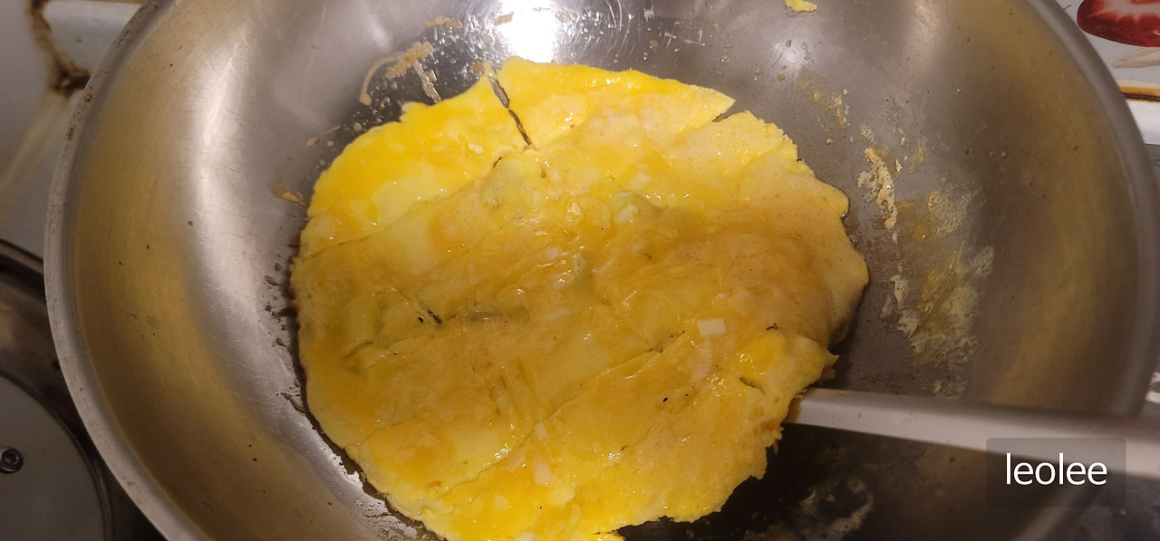 계란물을 다 풀었으면, 이제 웍에 기름을 두르고 약한 불에서 계란을 익힌다. 김밥이나 떡국 고명 만들 때처럼 천천히 익히는 게 포인트다.