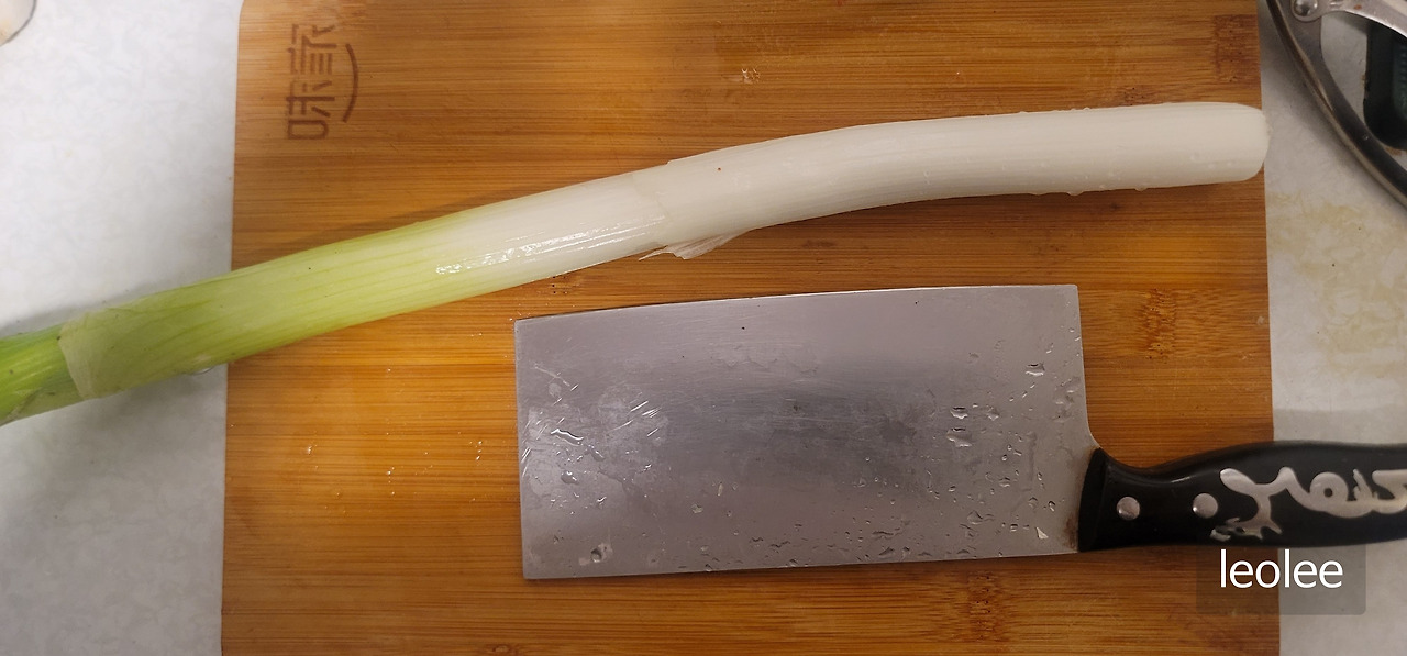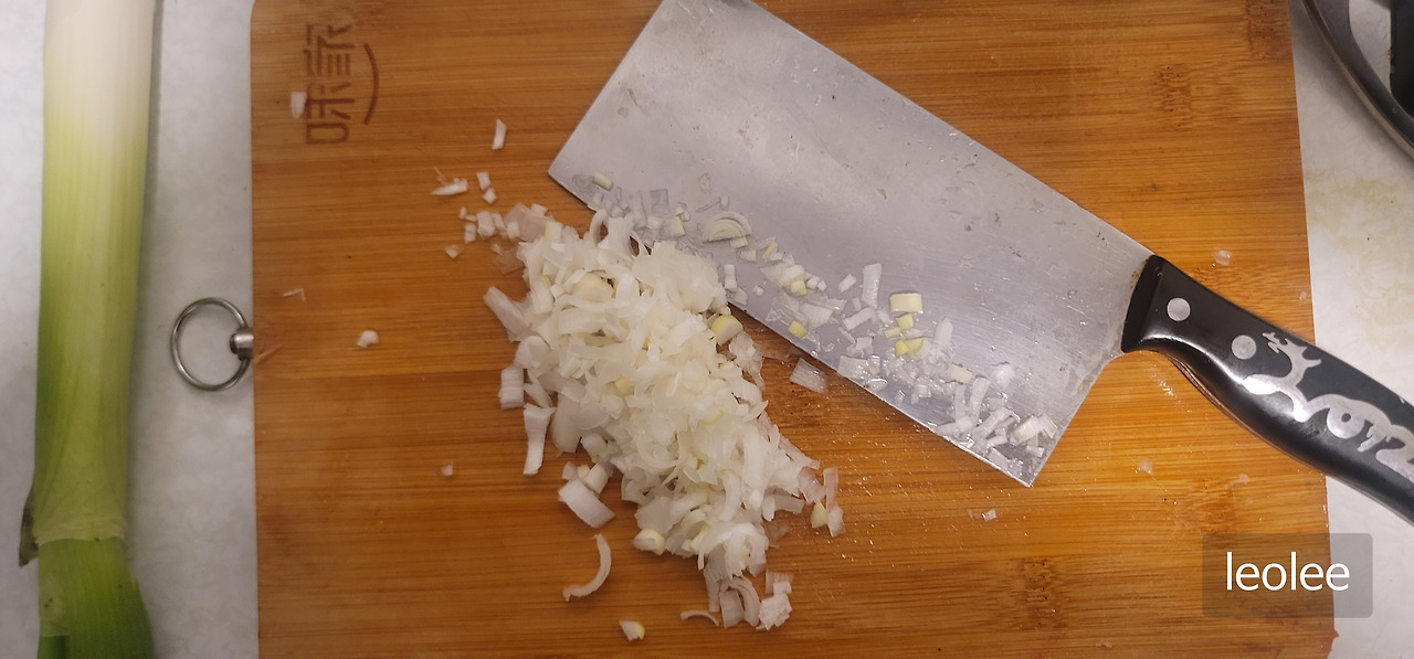그다음은 대파를 준비한다. 흰 부분만 사용해서 아주 잘게 썬다. 대파 향이 은은하게 퍼지면 음식이 더 맛있어지니까 이렇게 한다.
