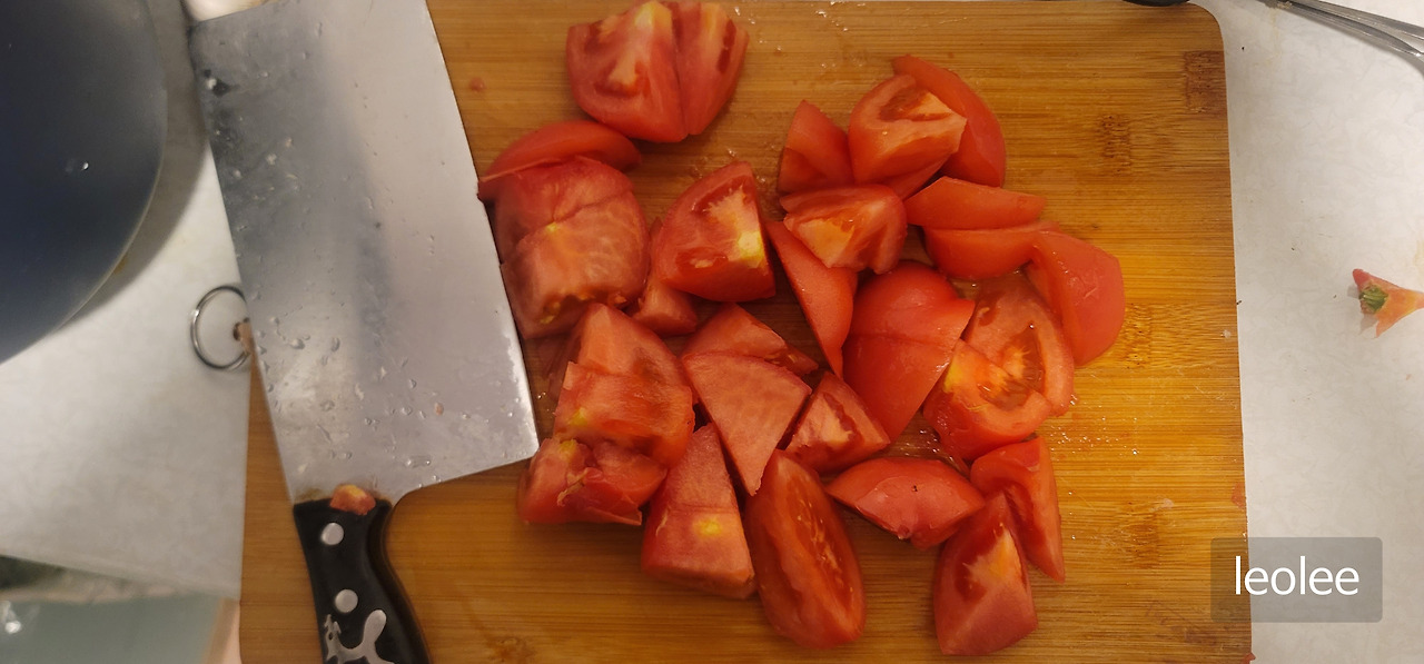 껍질을 깔끔하게 벗기고 나면, 토마토를 큼직하게 썬다. 너무 작게 썰면 조리하고 나서 모양이 흐트러져서 보기가 별로라고 본다.