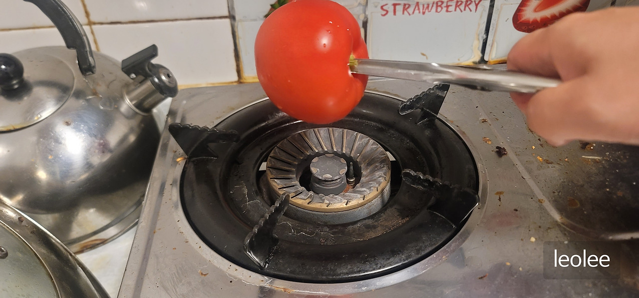 먼저 토마토를 구워준다. 조금 이상하게 들릴 수도 있겠지만, 이건 껍질을 벗기기 위해서 하는 과정이다. 그냥 써도 되긴 하는데, 나는 이렇게 하는 게 편하다. 얼마나 굽냐면, 겉이 퍽 소리 날 때까지 돌려가며 굽는다. 이러면 껍질이 마르면서 아주 쉽게 벗겨진다.