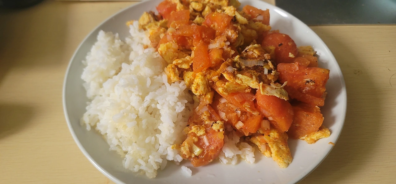 나는 이렇게 완성된 시홍시차오지단을 밥 위에 얹어서 덮밥처럼 먹는 걸 좋아한다. 이게 간단하면서도 꽤 든든한 한 끼다. 이렇게 또 한 끼 해결했다.